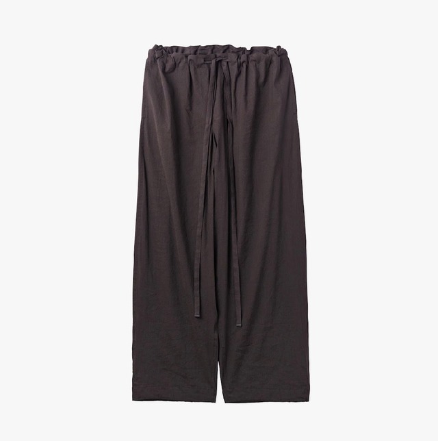 BRAND-UNTRACE ITEM ID-253 QUALITY- LINEN 58% RAYON 39% POLYURETHANE 3% SIZE ONE Waist 132cm / Rise 33cm / Inseam 78cm / Hem width 28cm COLOR-DARK BROWN 道着や袴を彷彿とさせる、新作のビッグワイドパンツ。 素材には、リネンとヴィスコースを交織した軽やかな布帛を採用。バイオウォッシュによるリネンの柔らかな風合いと、ヴィスコース特有の上品な落ち感が相まって、快適な穿き心地を実現しています。 ストレッチ性を備えており、着用時のストレスが少なく、動きにしなやかに寄り添う柔軟性も魅力。 上質な素材をふんだんに使用し、非常に広くとられたウエストをドローコードで絞ることで生まれる、豊かなギャザーが美しく、体型を問わず着用いただけます。 長めに設計されたドローコードと、その先端に配されたカンヌキが、ミニマルな佇まいにさりげないアクセントを加えています。 リラックス感を持ちつつ、どこか上品で都会的な印象を漂わせる一本です。