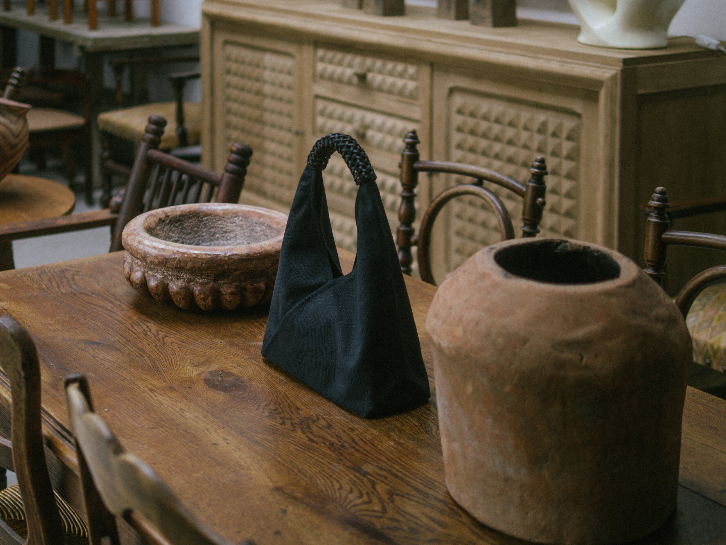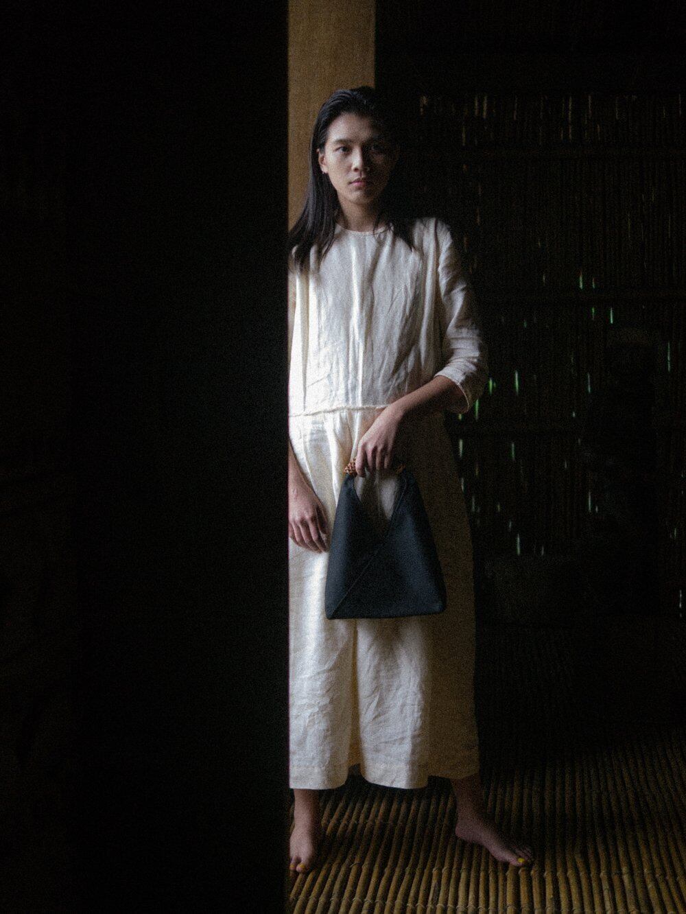 台湾の先住民族の伝統的な編み方をハンドル部分に用いたキャンバス生地のトライアングルバッグで、使い込むごとに色合いが変化するといった経年変化も楽しめます。