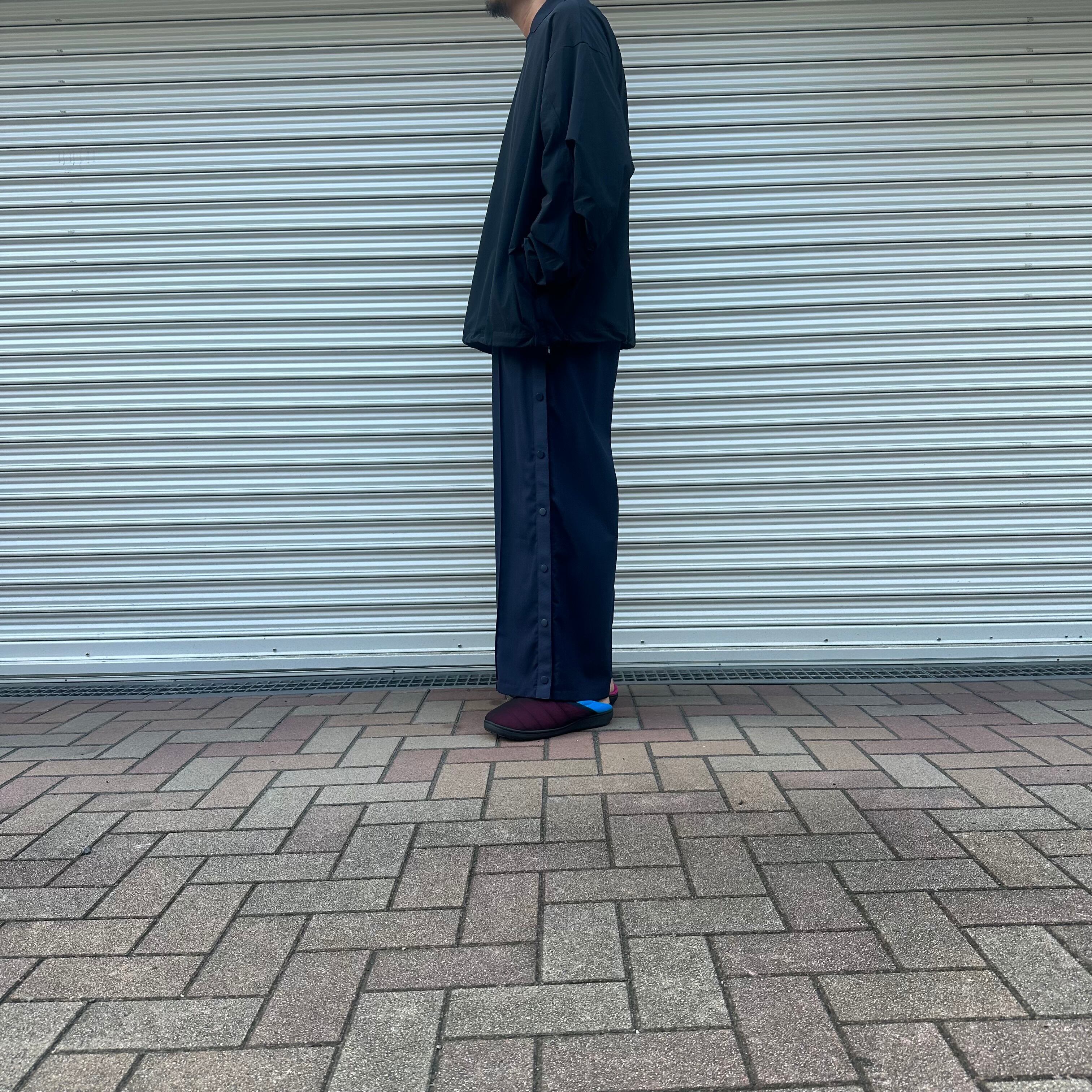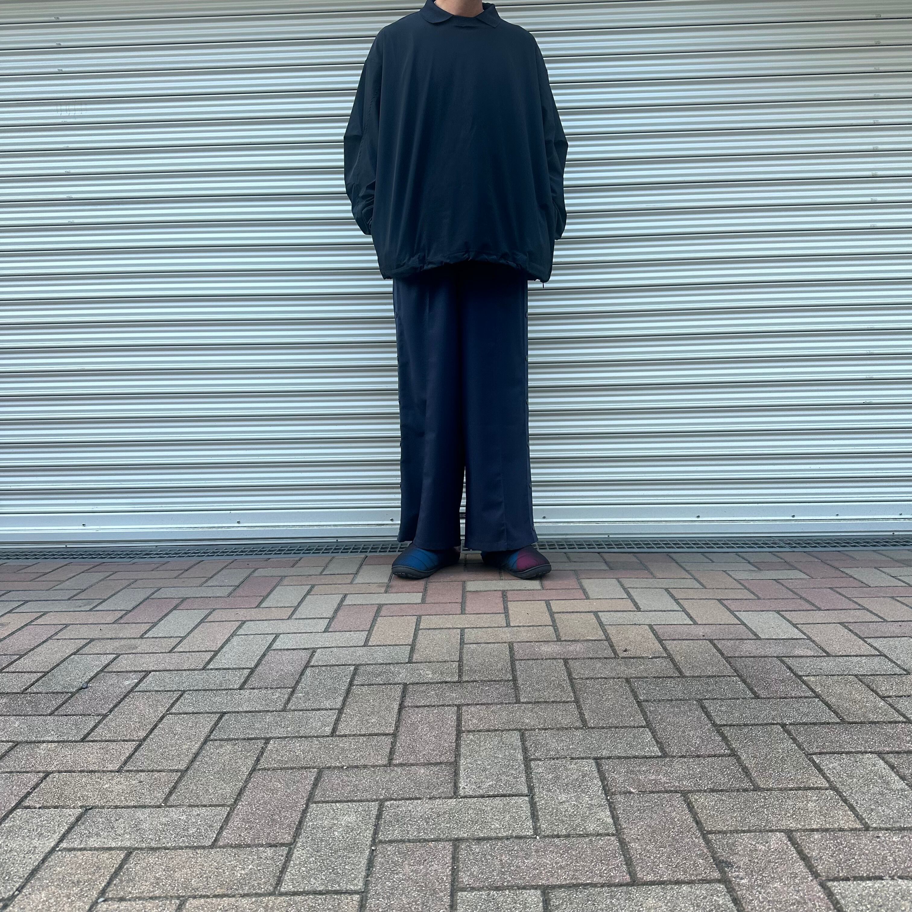 裾で生地が遊び、ワイドストレートなシルエットは、裾部分のドットボタンだけ開くことでフレアシルエットに変化が楽しめます。ヒップポケット付き。