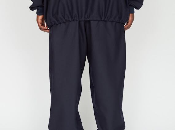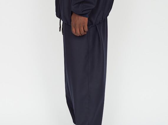 フロントにはタックを配し立体的な表情を持たせ、素材の落ち感により裾に美しいたまりを生み出します。