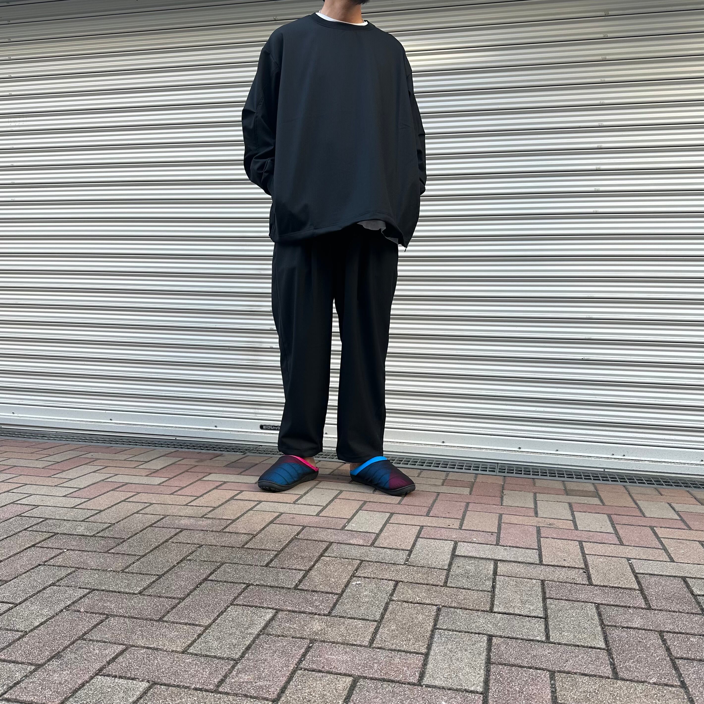 フロントにはタックを配し立体的な表情を持たせ、素材の落ち感により裾に美しいたまりを生み出します。