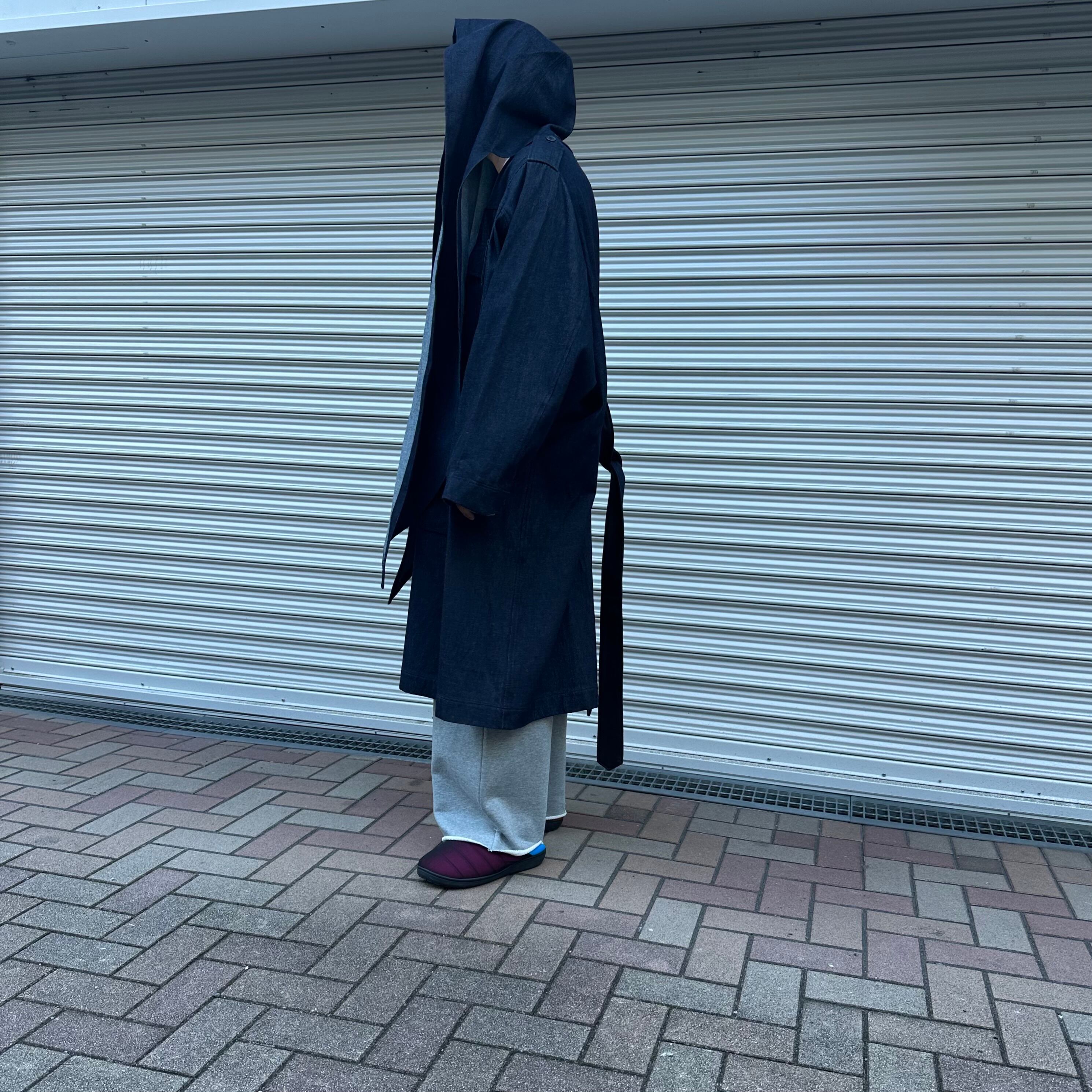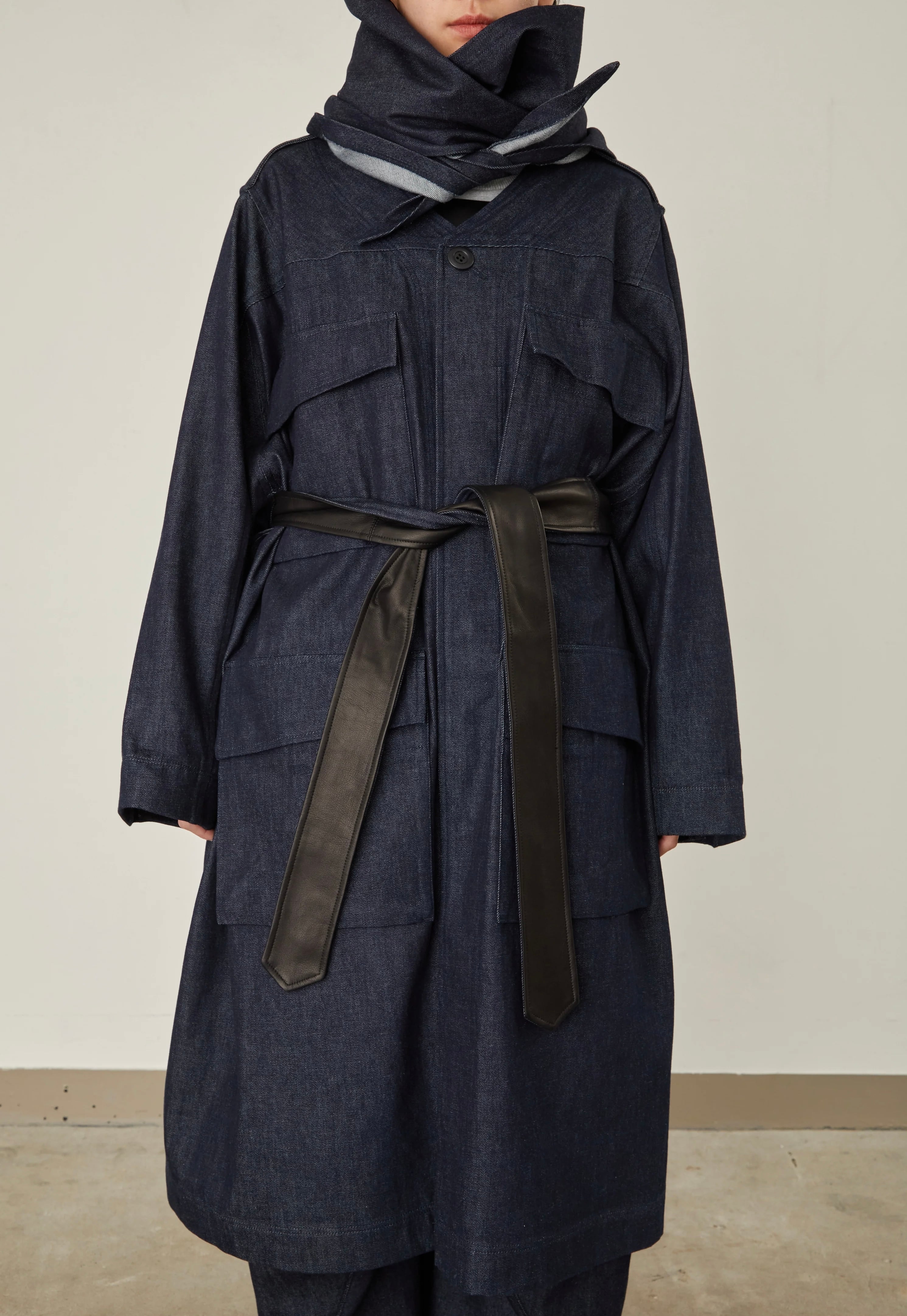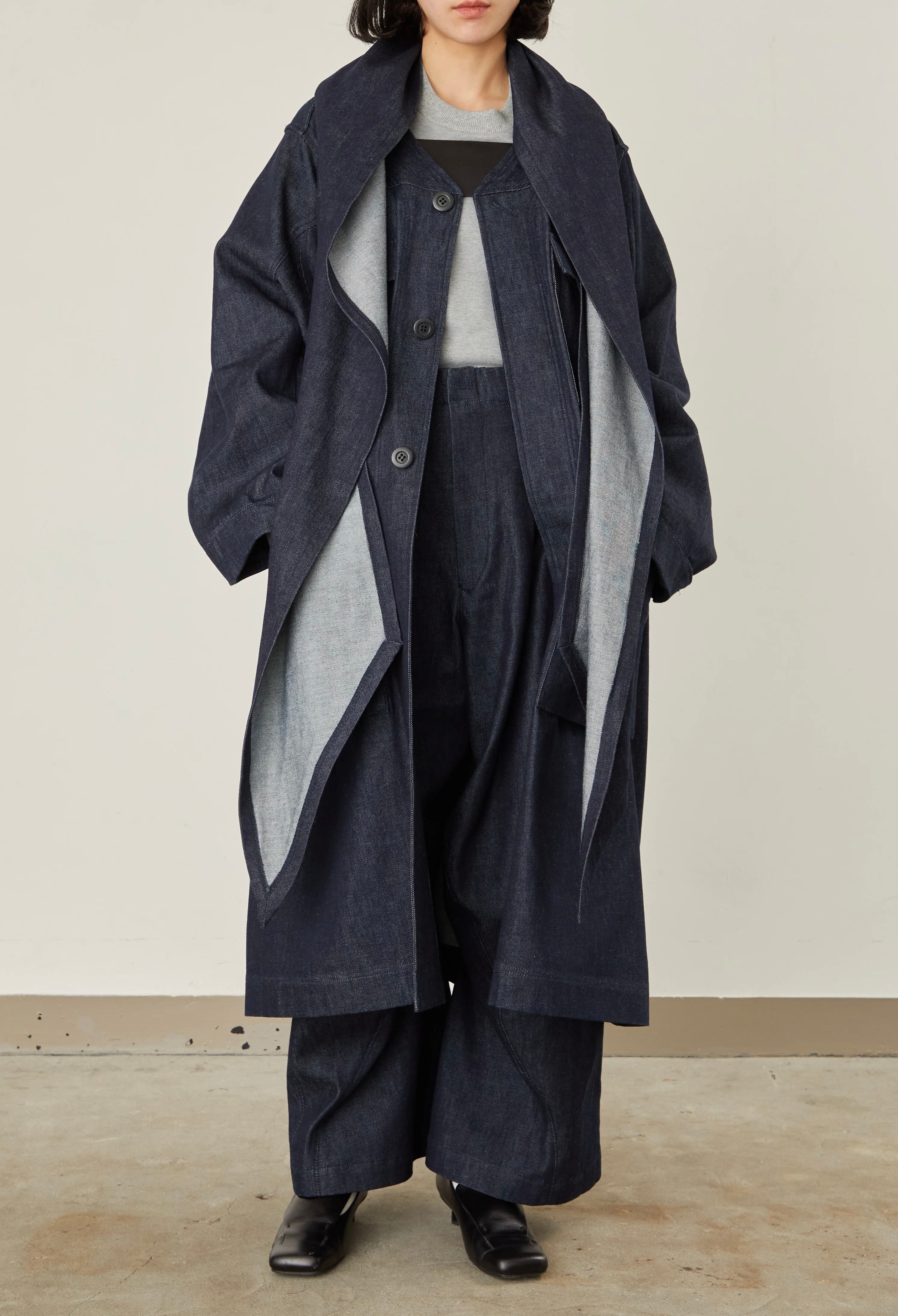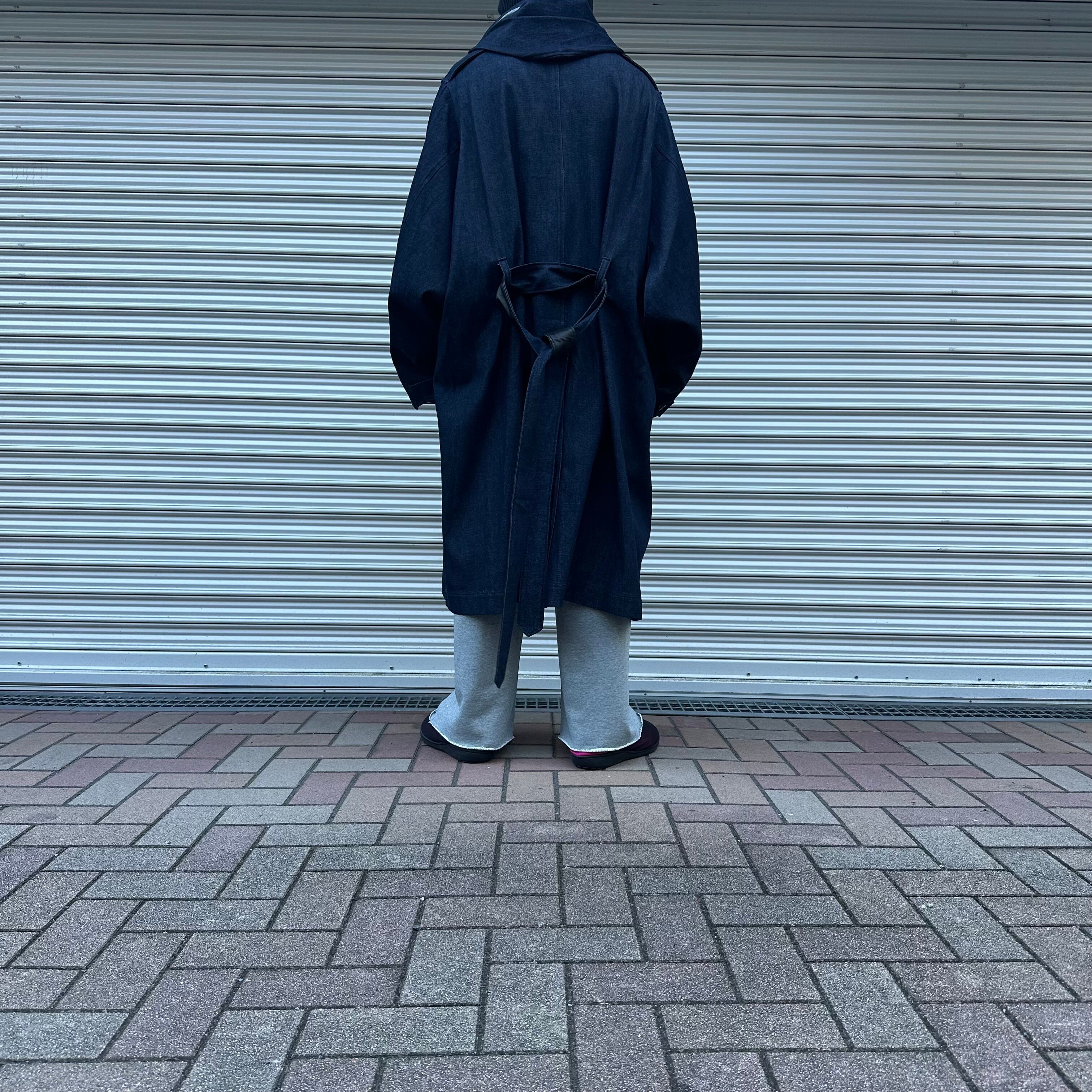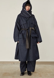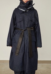 デニム素材で仕⽴てたハオリミリタリーコート。