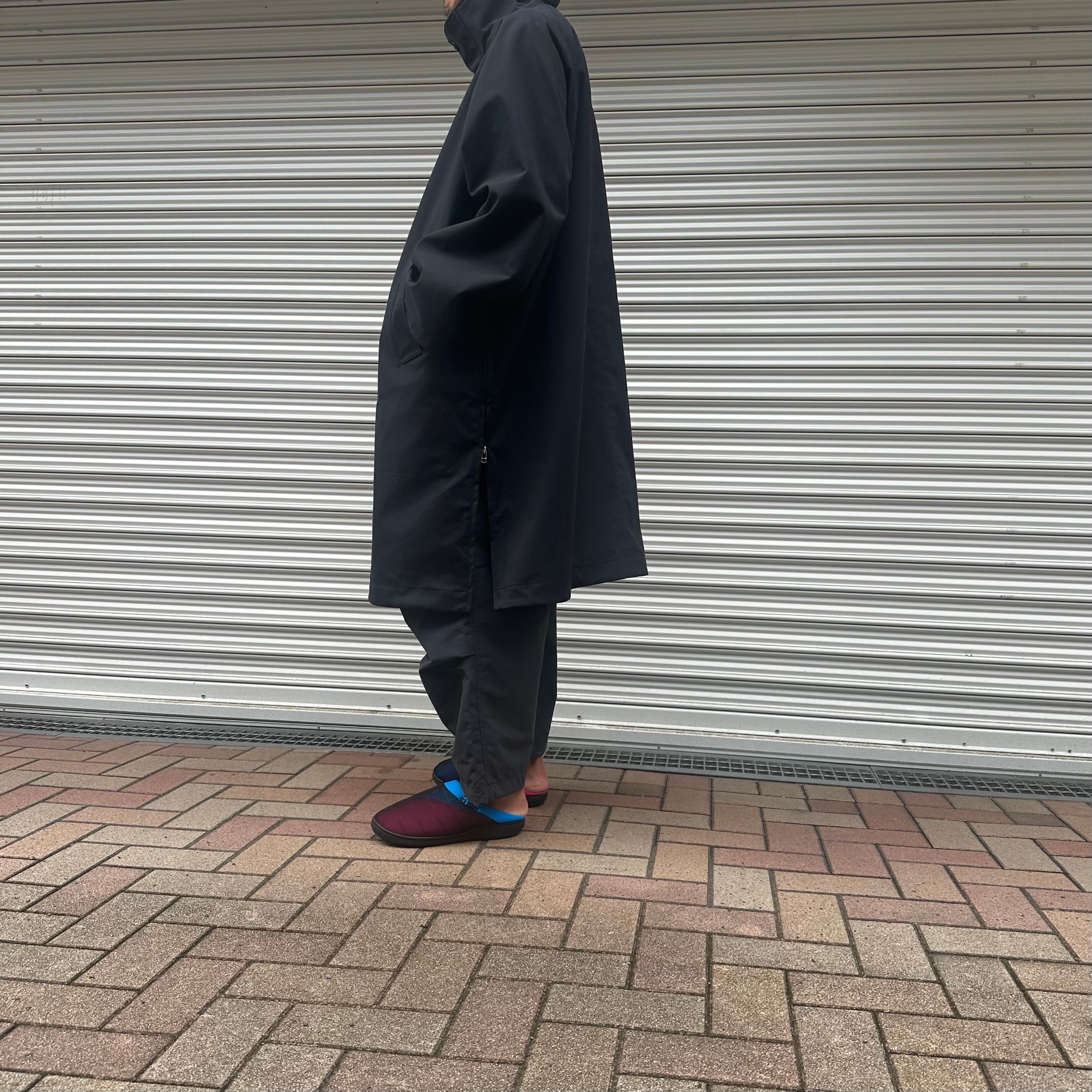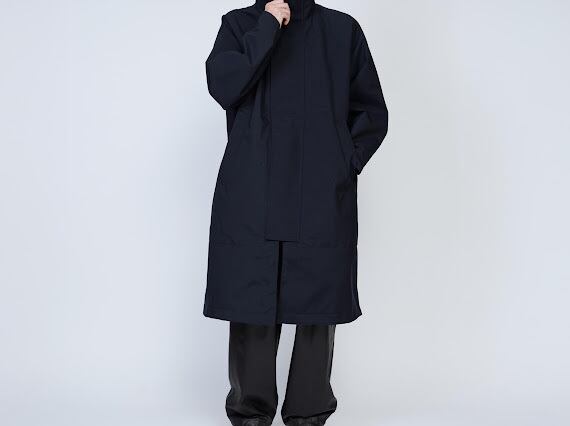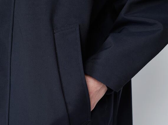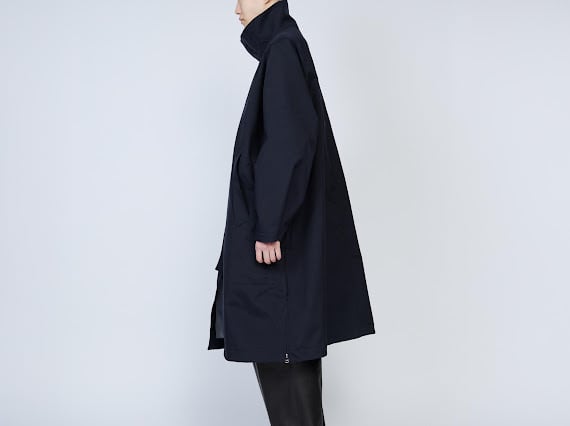 天然素材のような質感を持つタスランナイロンオックスを使用した、3レイヤーのスタンドカラーコート。