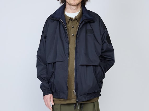 ポリエステルを高密度に織り上げ、防水性とストレッチ性を兼ね備えたツイル生地を使用したジップアップジャケット。