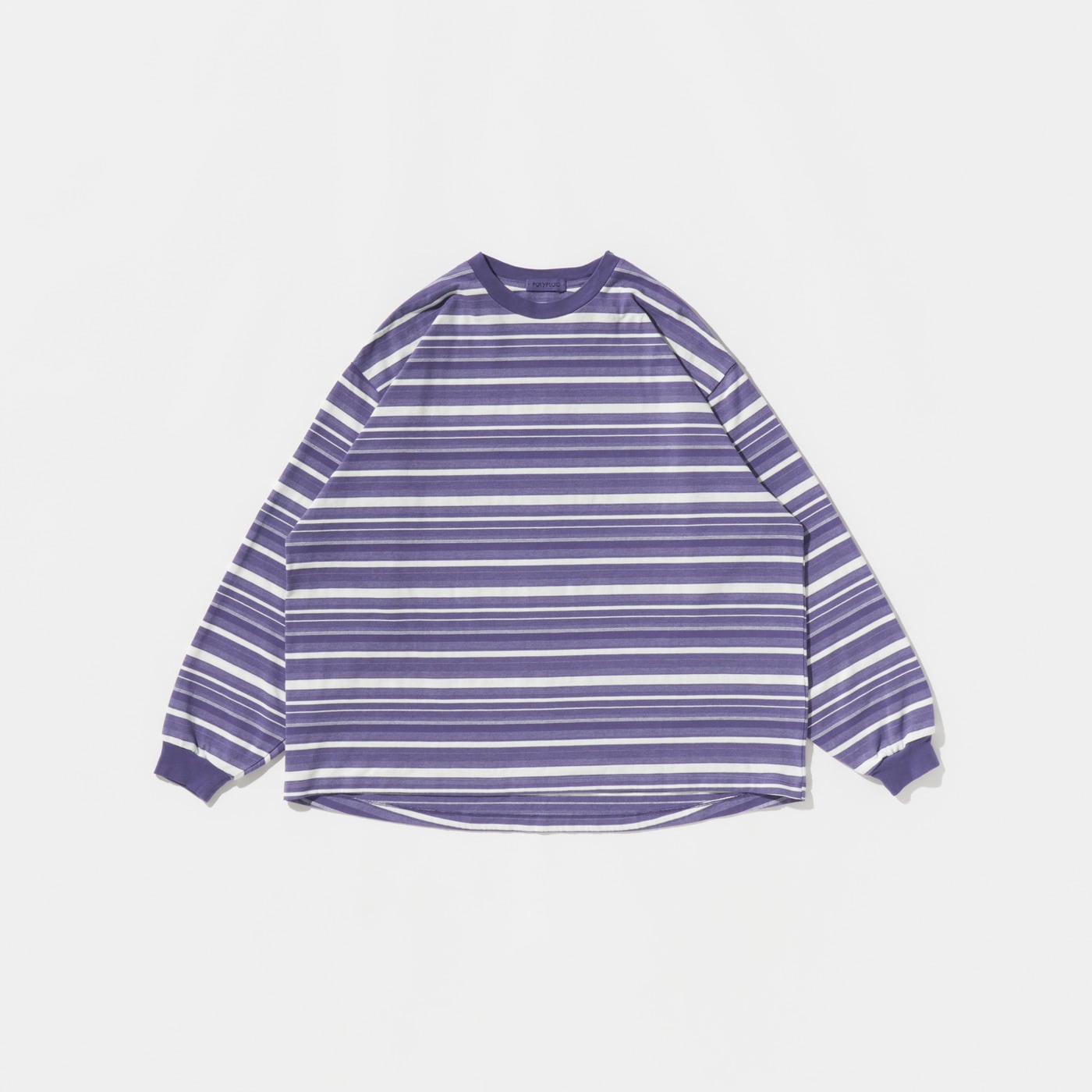 製品染めによって表現したマルチボーダーの天竺素材。綿とポリエステルの異なる糸を組み合わせることで、単色染めながらも奥行きのあるマルチカラーのような色合いを生み出しています。