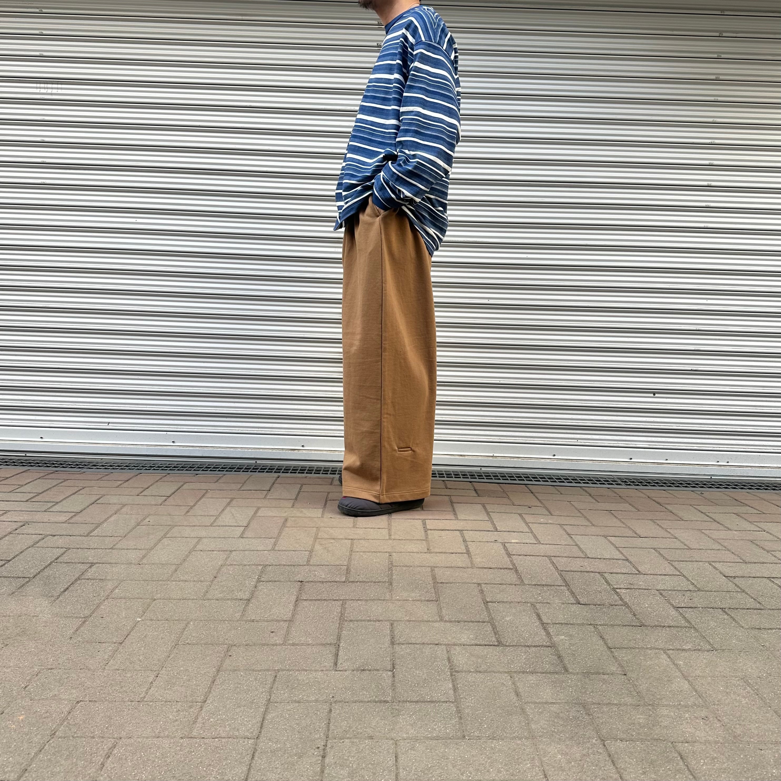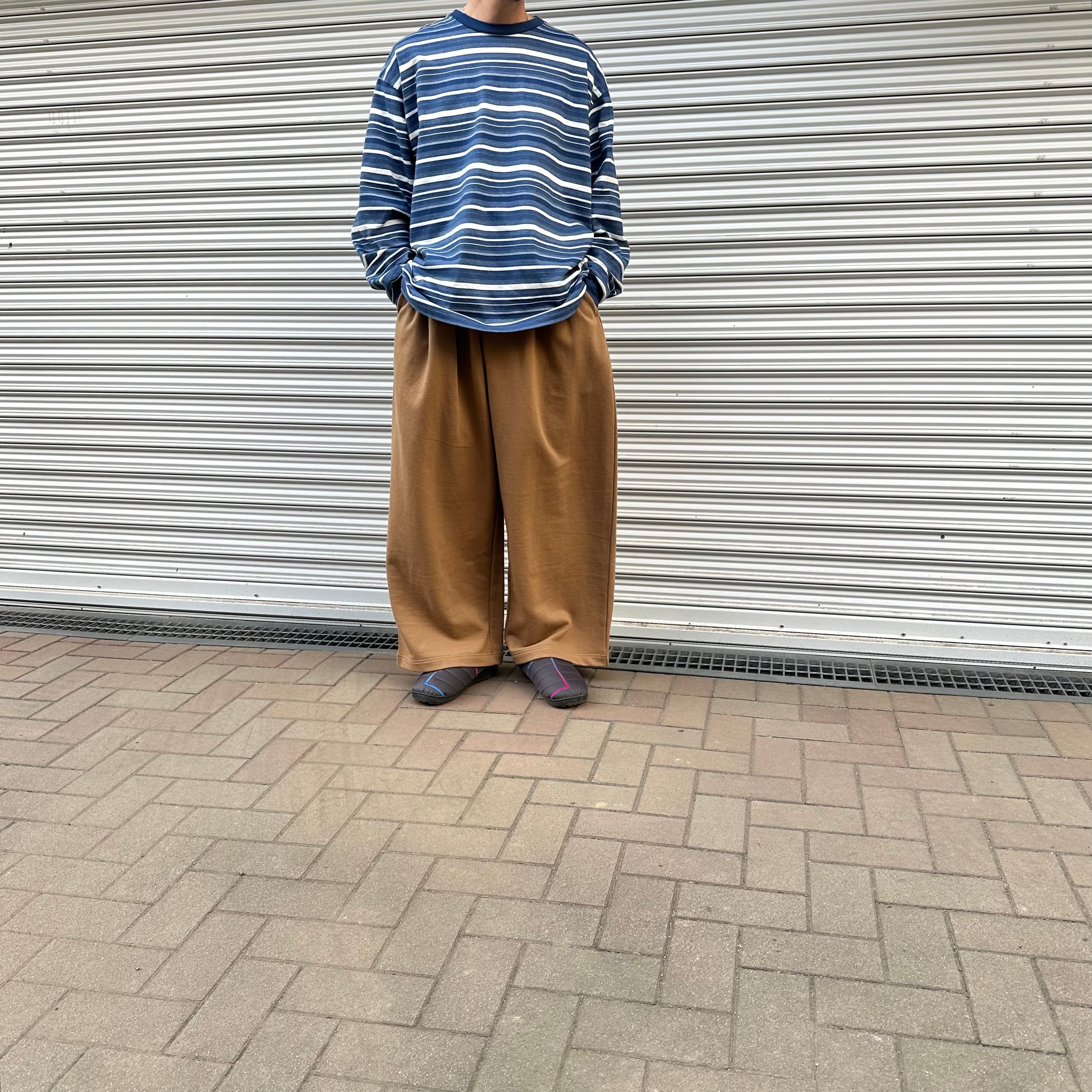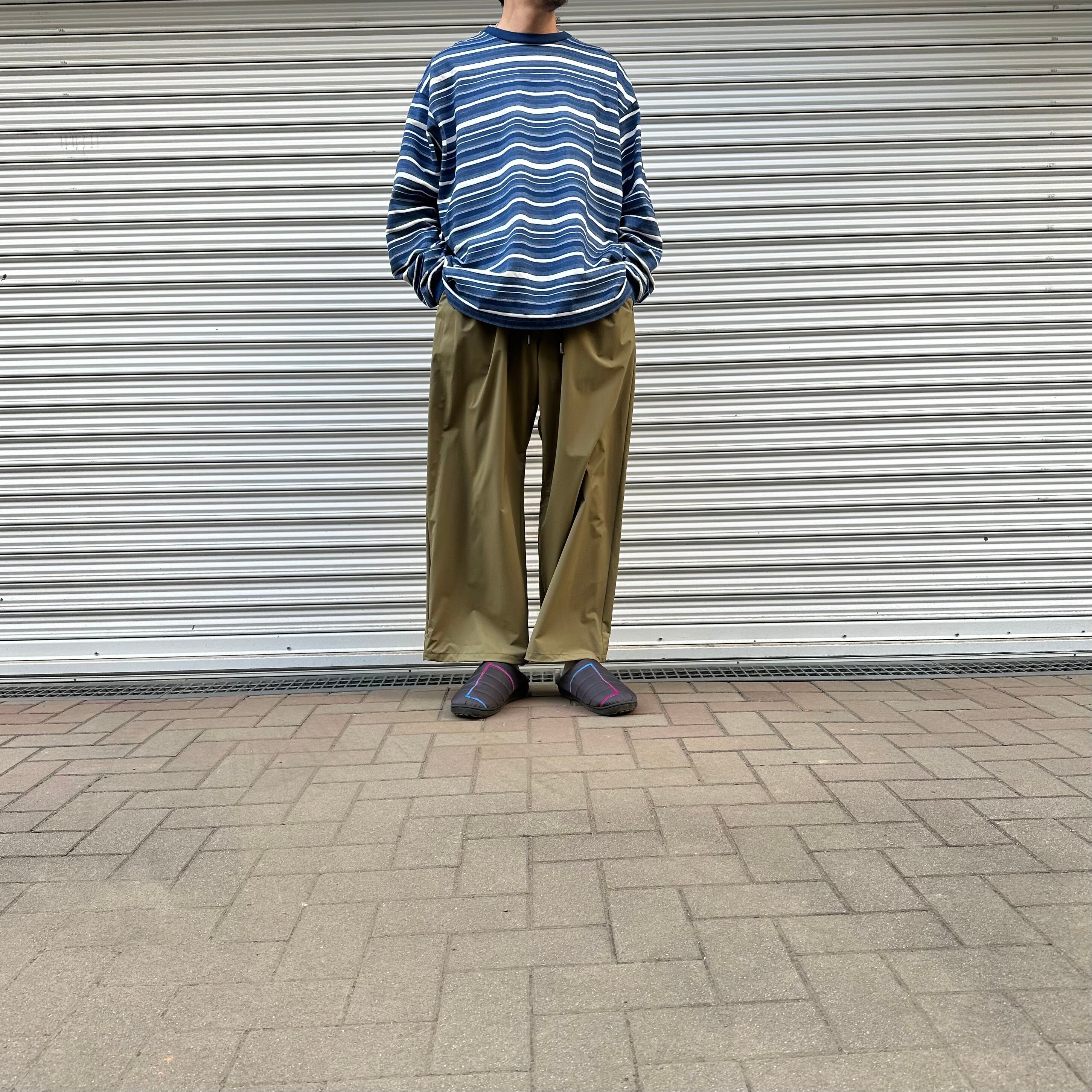 製品染めによって表現したマルチボーダーの天竺素材。綿とポリエステルの異なる糸を組み合わせることで、単色染めながらも奥行きのあるマルチカラーのような色合いを生み出しています。