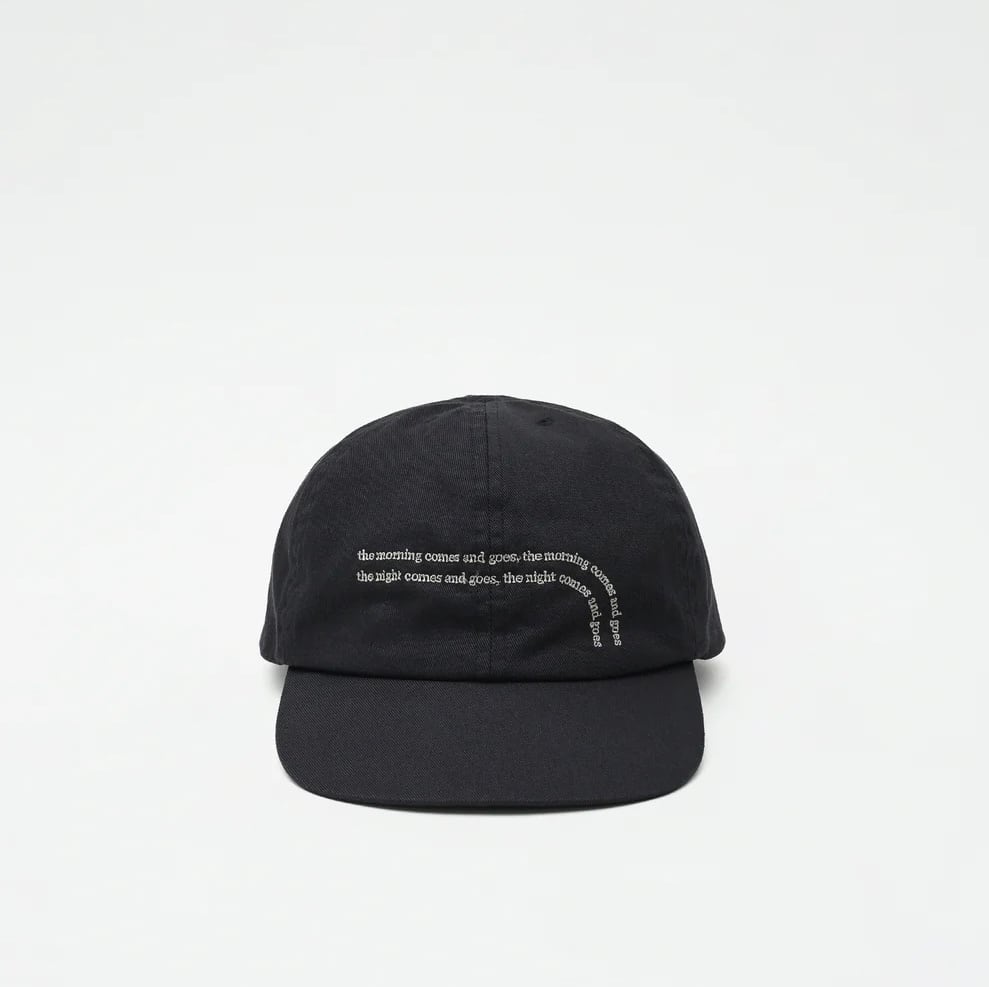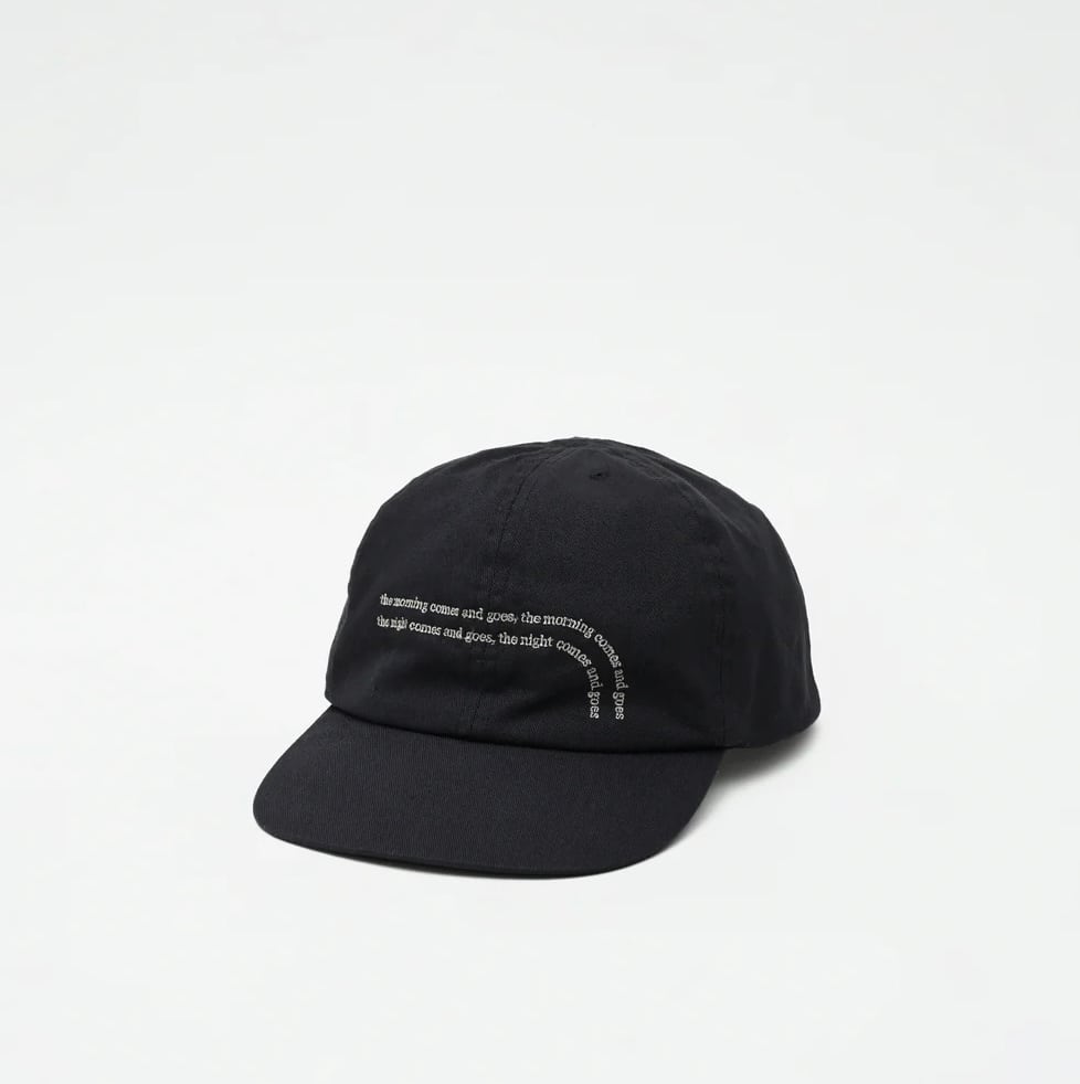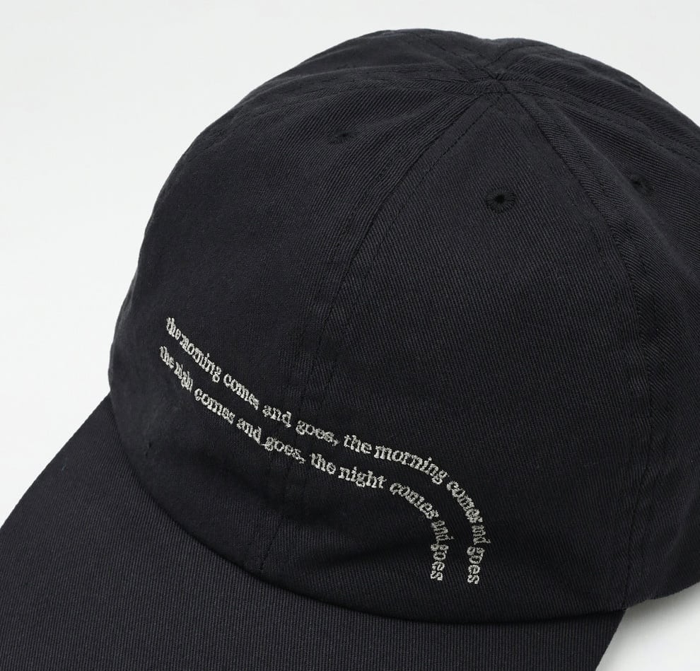 ブランドの語源の言葉 ”the morning comes and goes , the night comes and goes” (朝は訪れ去って行く、夜は訪れ去って行く)を細かく繊細に刺繍した6パネルキャップ。