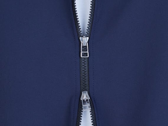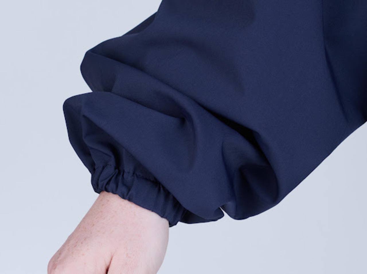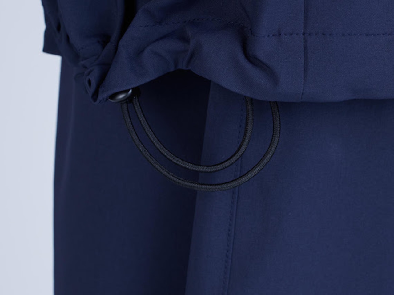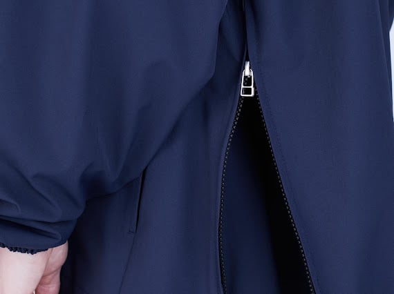 右裾にはスピンドル、左裾にはジップを配し、シルエットや通気性の調整が可能。機能性と美しさを兼ね備えた一着です。