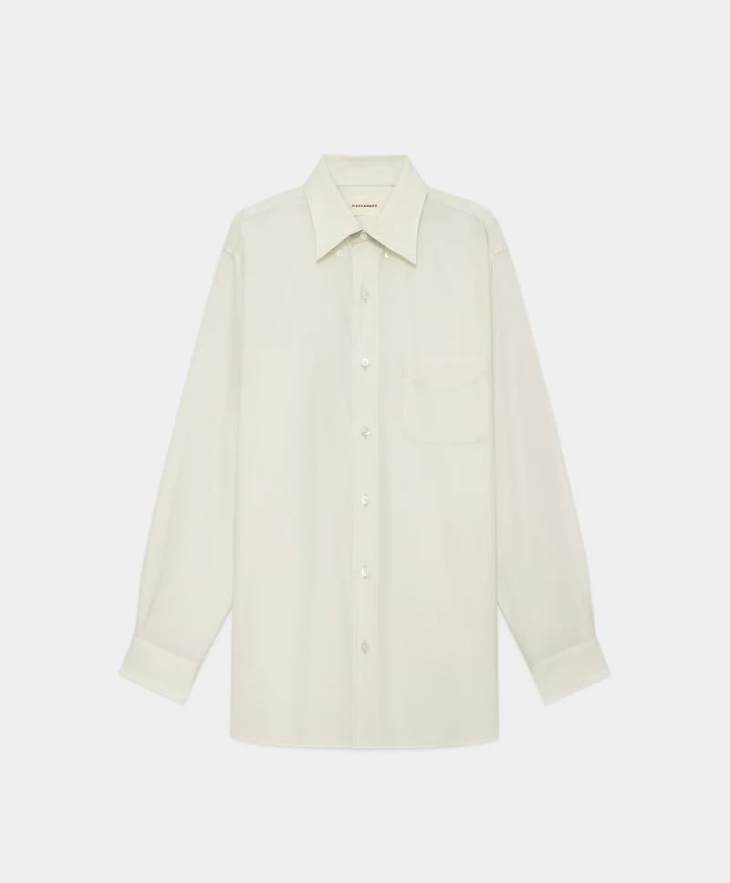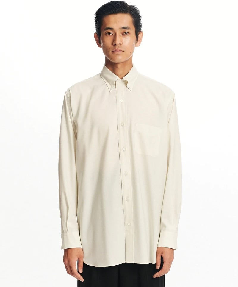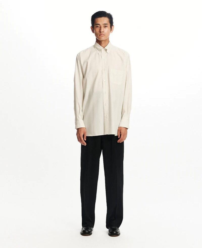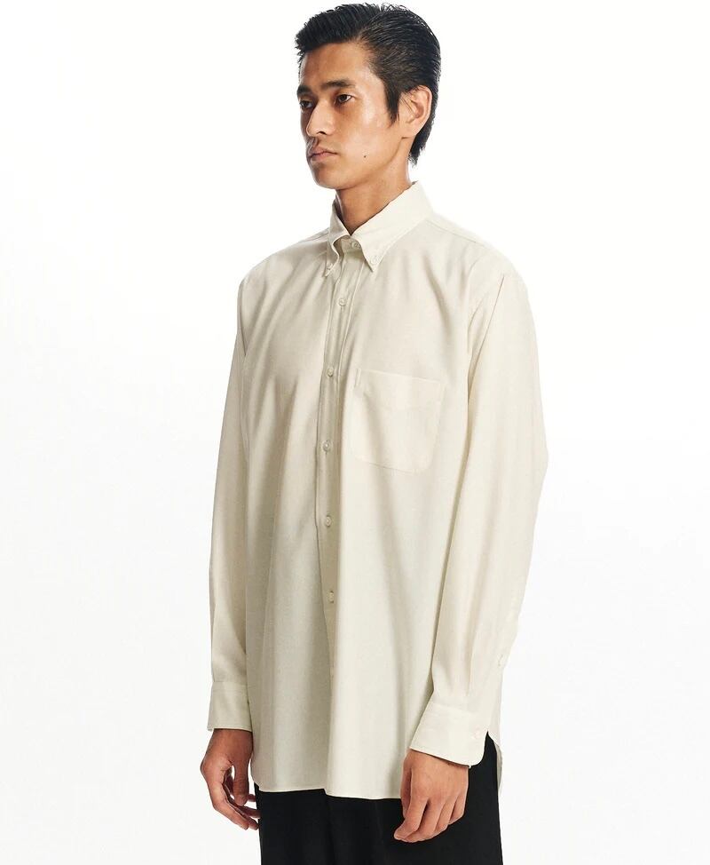 オーセンティックなシャツのディテールを踏襲しつつ、ブランド独自の解釈を取り入れています。身幅を広く取ることで、裾に向かってストンと落ちるラインを描く設計に。肩はわずかにドロップさせ、1枚で着た際はもちろん、ジャケットを羽織った際にも美しく収まるバランスに仕上げました。