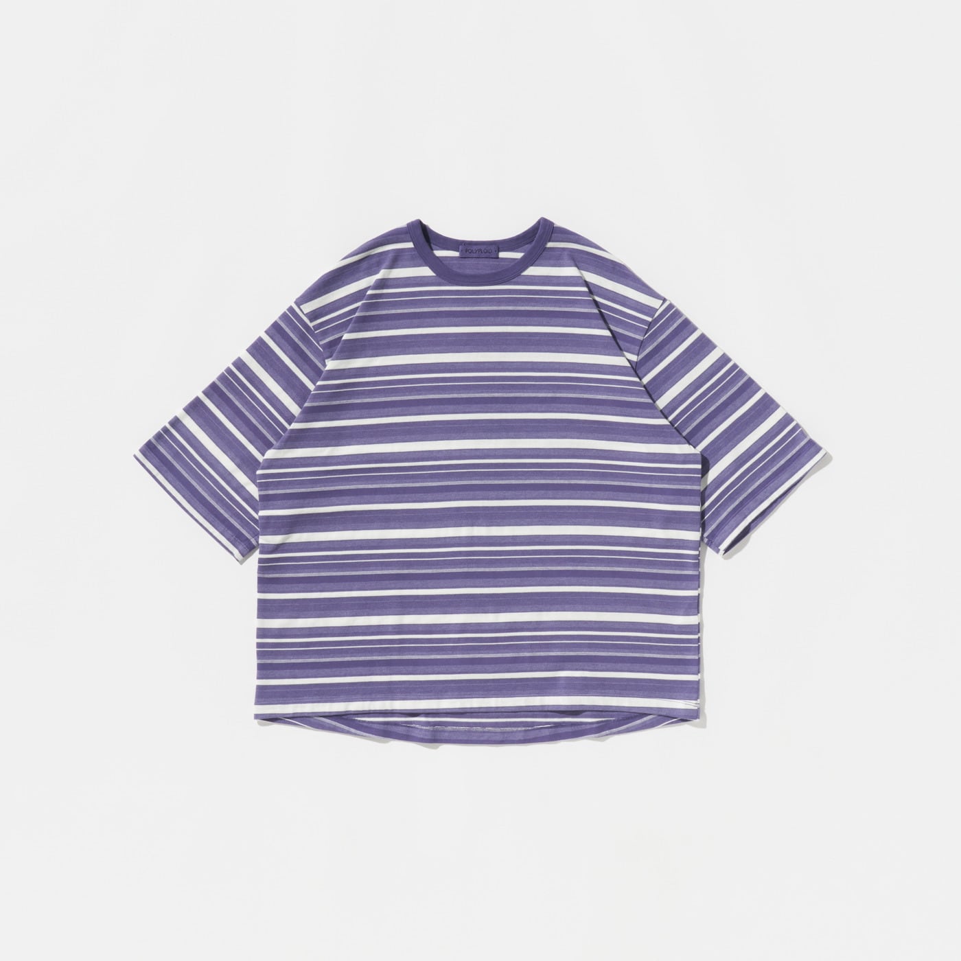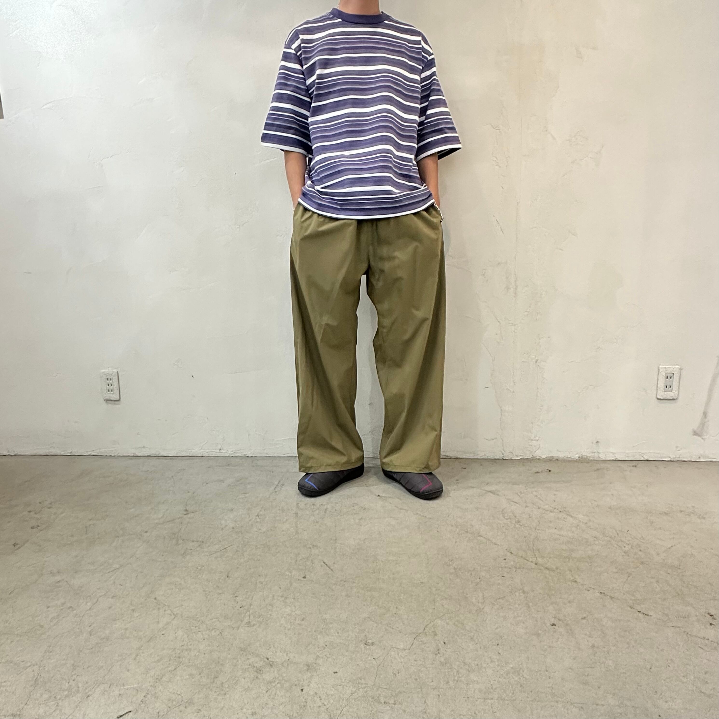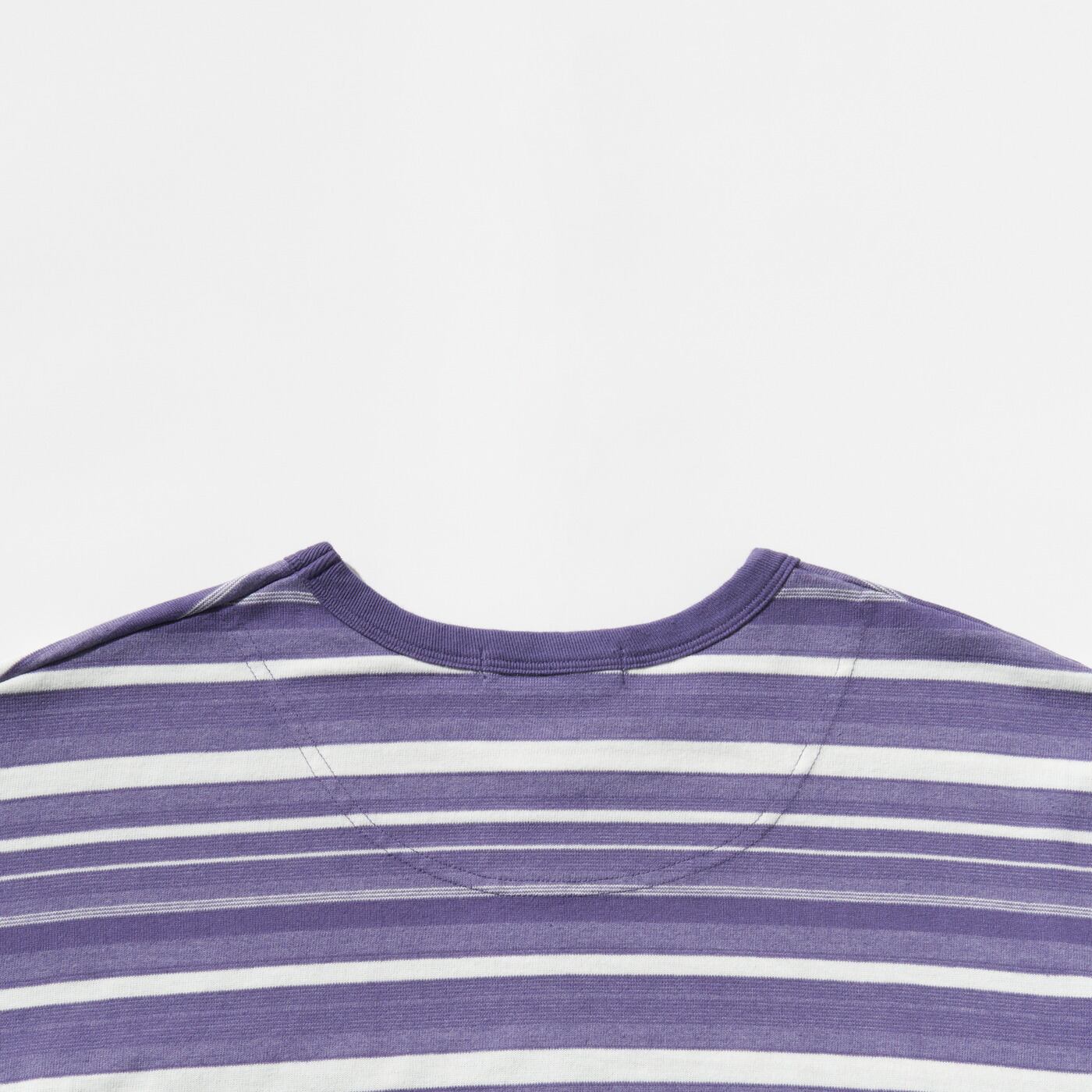 製品染めによって表現したマルチボーダーの天竺素材。綿とポリエステルの異なる糸を組み合わせることで、単色染めながらも奥行きのあるマルチカラーのような色合いを生み出しています。