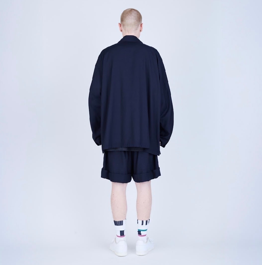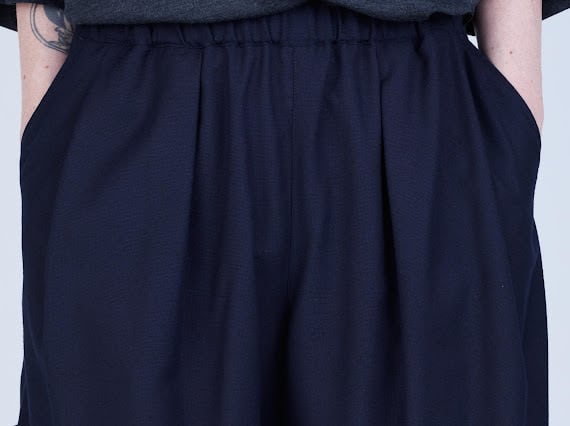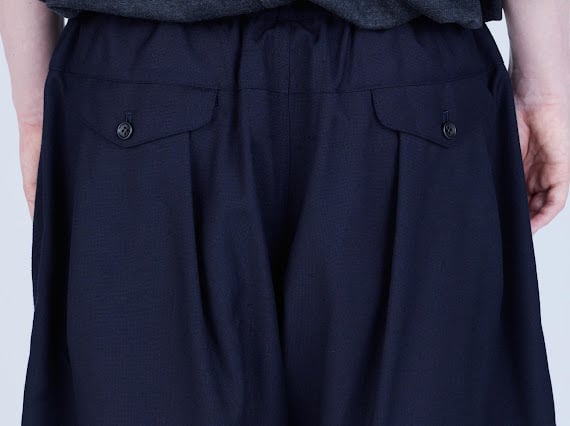バスケットショーツから着想を得たボリュームシルエットに、スラックスを思わせる裾の仕立て、そしてフロントに施した深めのタックが特徴。ラフな印象の中にクラシカルなムードを共存させています。