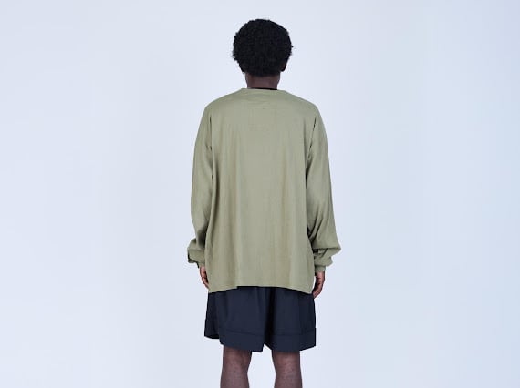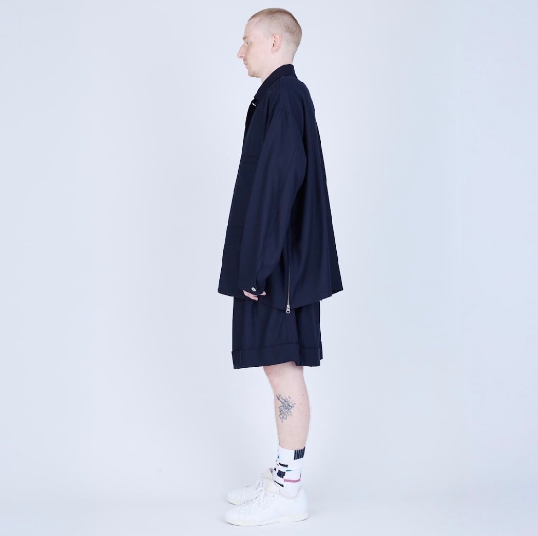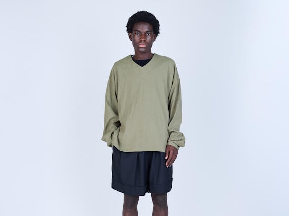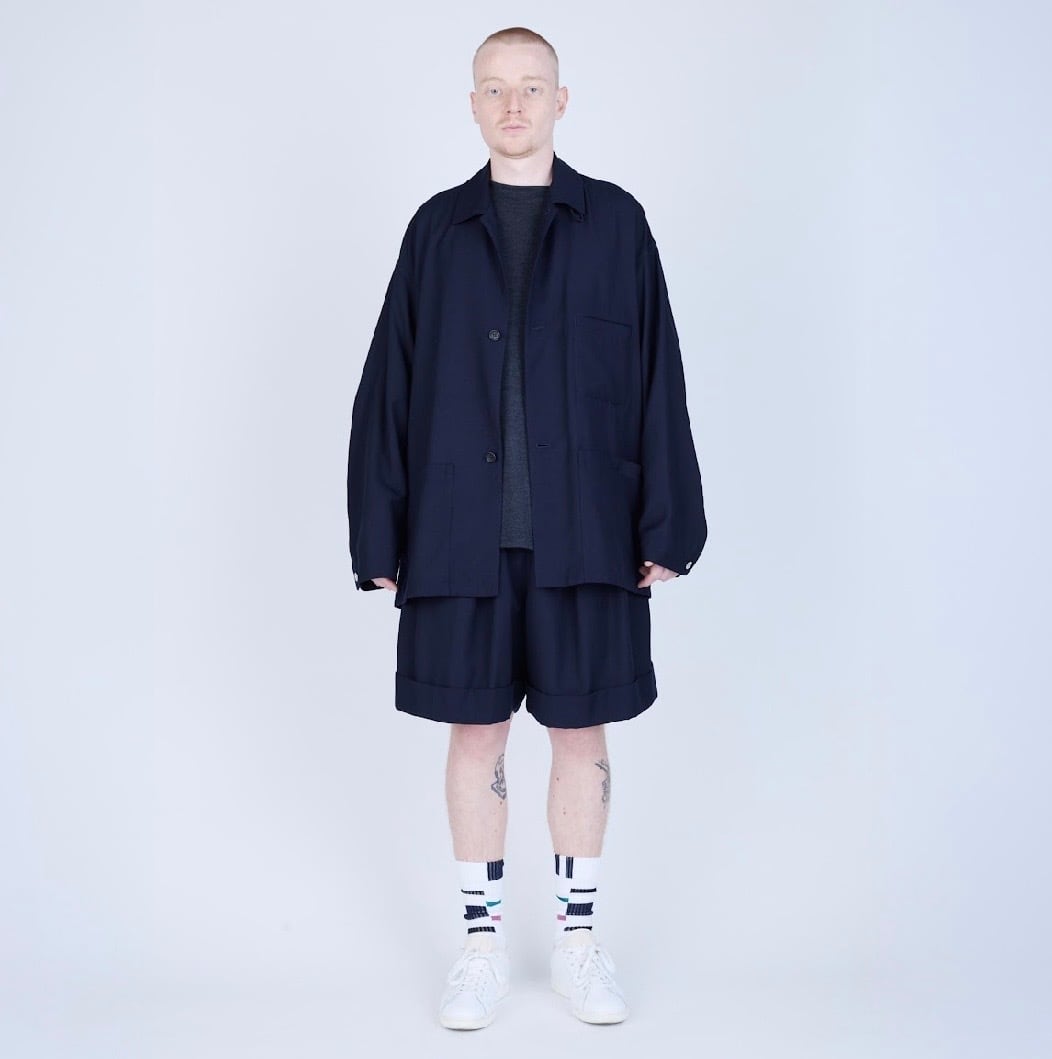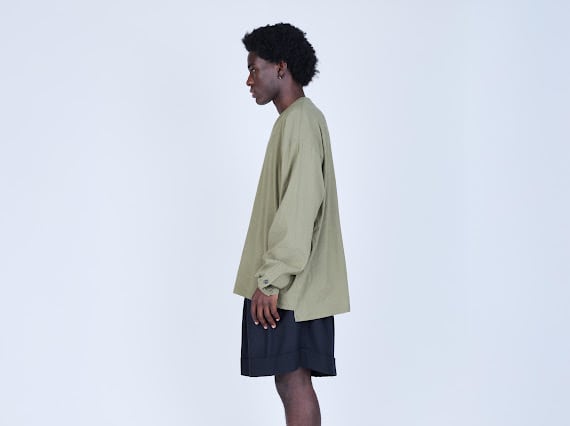 バスケットショーツから着想を得たボリュームシルエットに、スラックスを思わせる裾の仕立て、そしてフロントに施した深めのタックが特徴。ラフな印象の中にクラシカルなムードを共存させています。