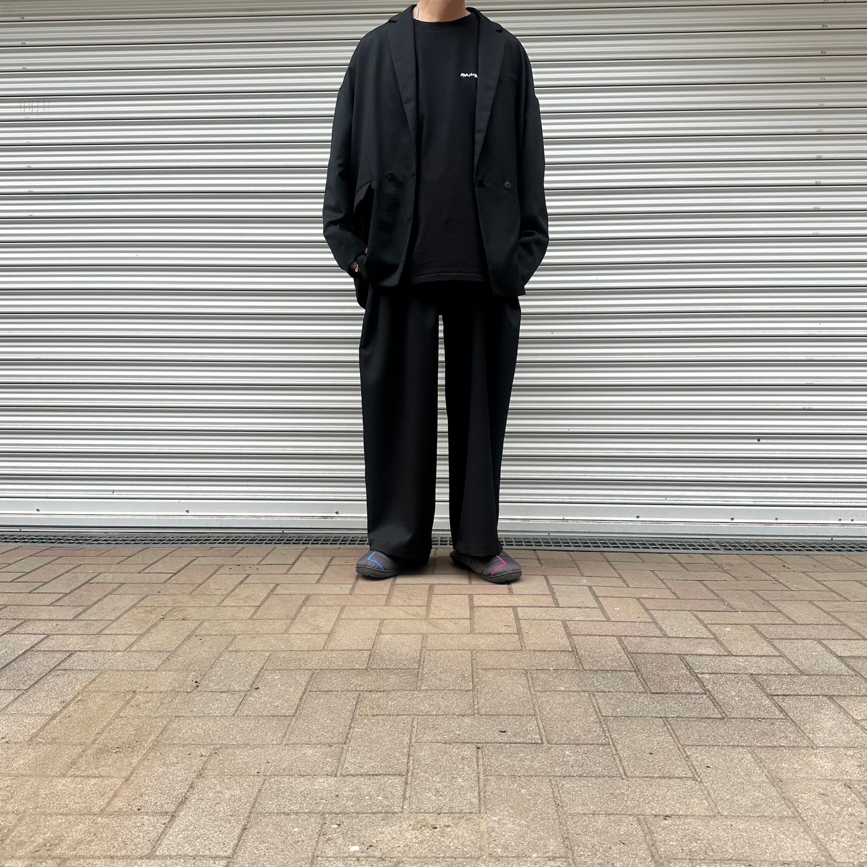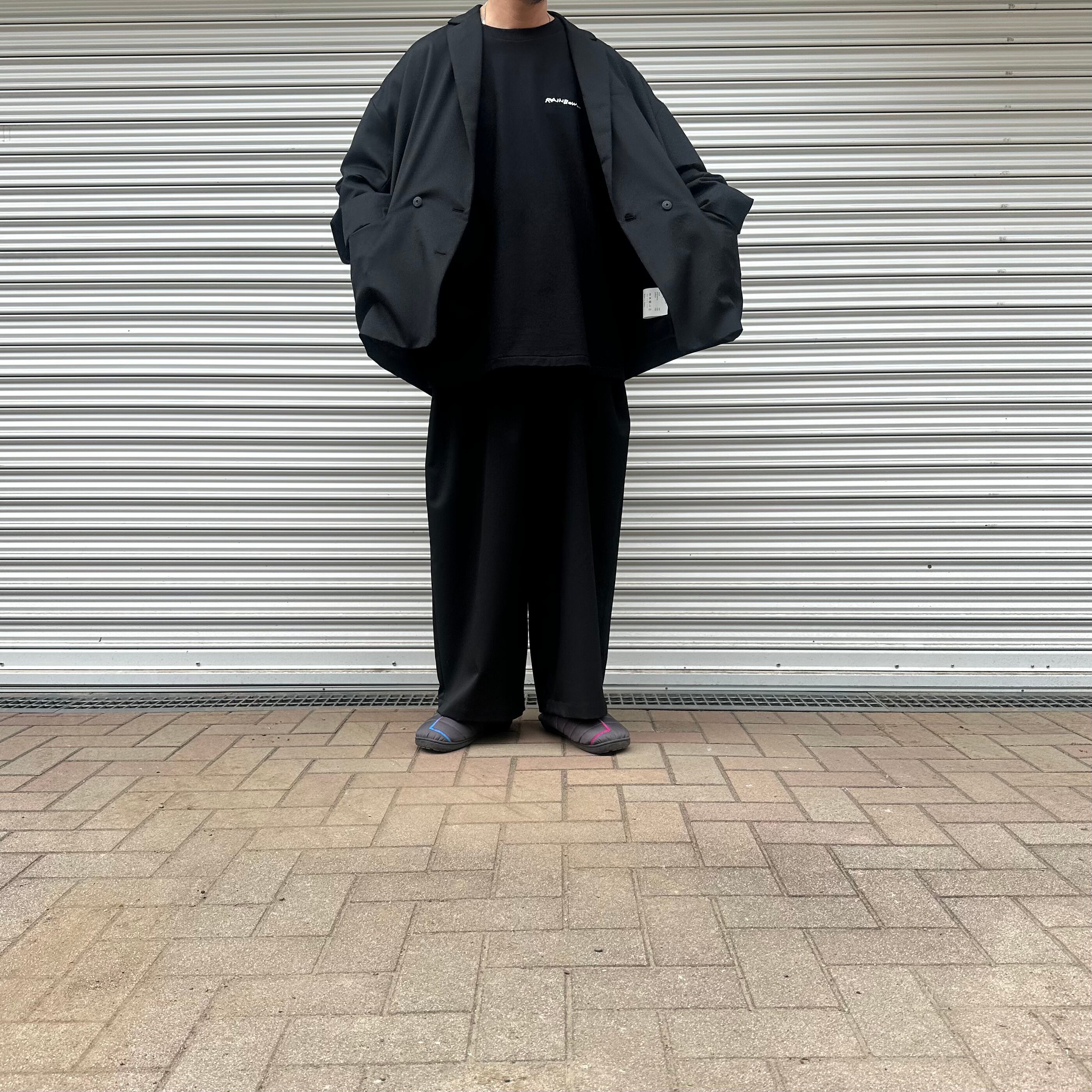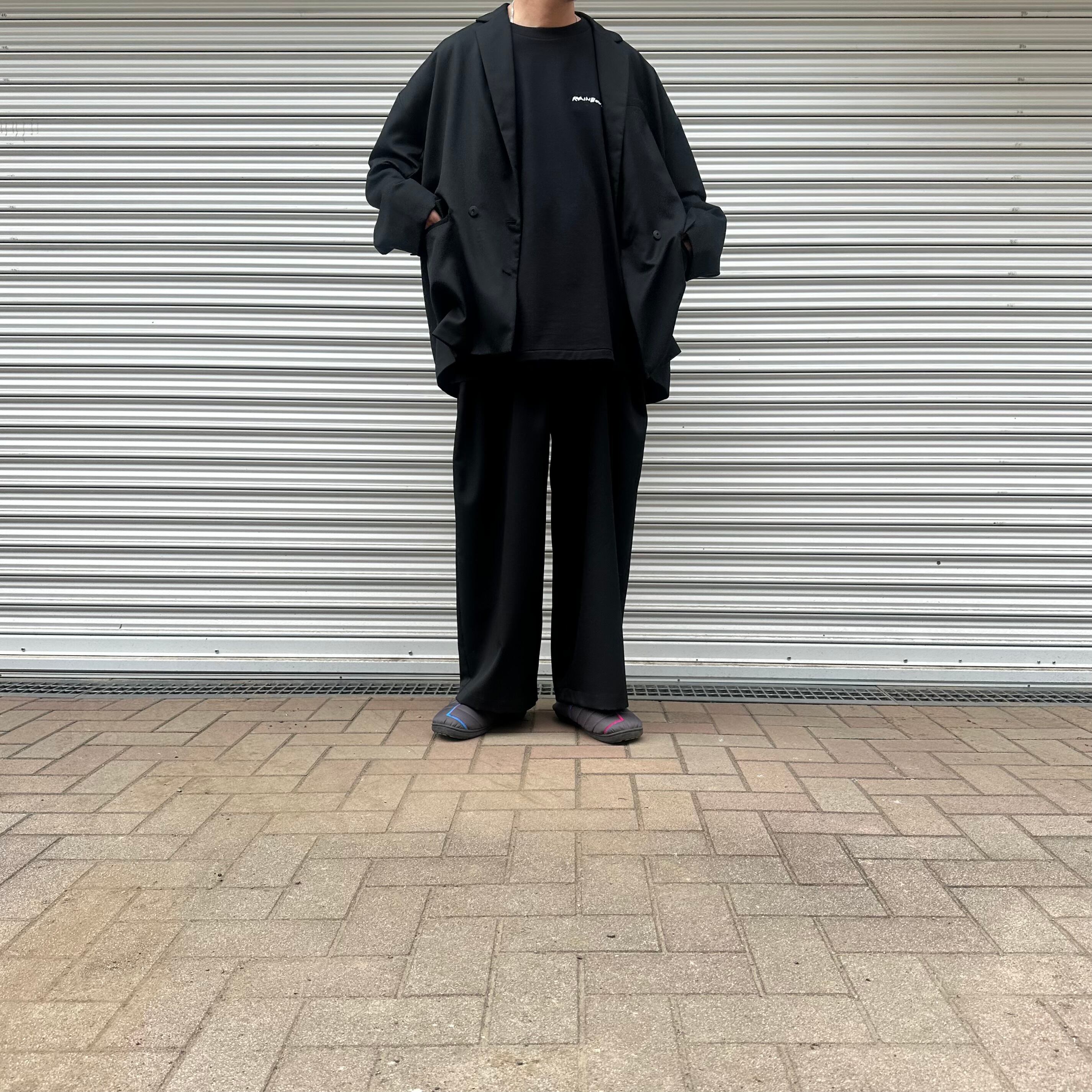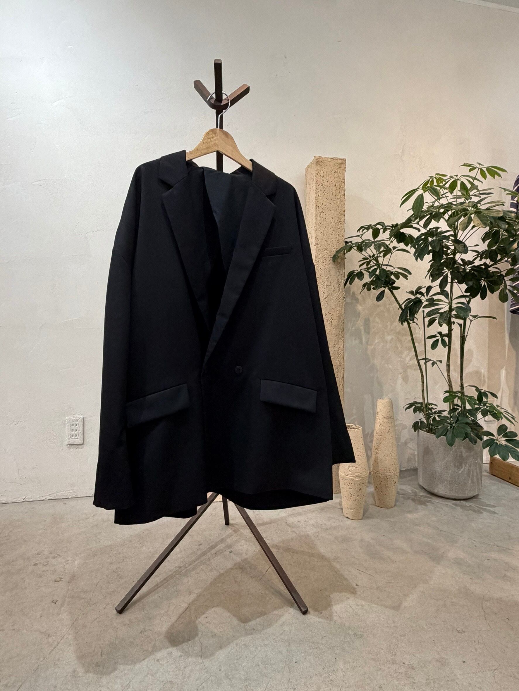 ドロップショルダー、ワイドでゆったりとしたルーズなシルエットのダブルジャケット。