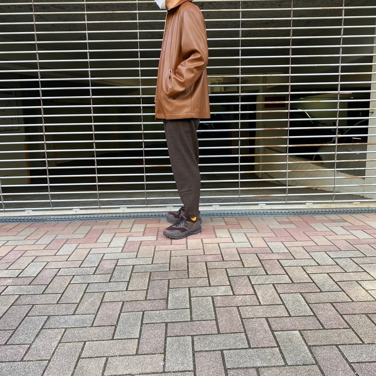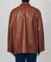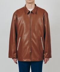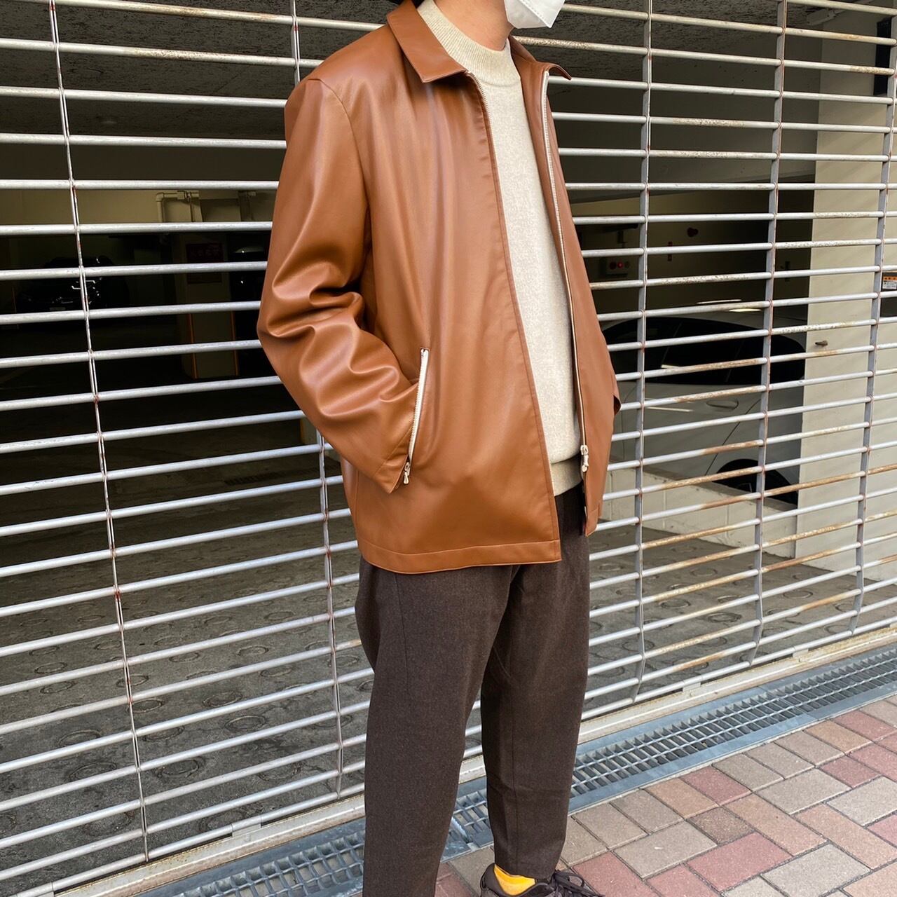 ロイヤルレザー。表面がリアルレザーに近く、適度な艶感・高級感のある、湿式タイプの合成皮革です。ストレッチ性があり、ソフトでしなやかな風合いが特徴です。着心地の軽さ、見た目のキレイさ、扱いやすさが特徴です。シルエットは立体を意識したドロップショルダーのコクーンラインです。フロント・ポケットにririのファスナーを使用しています。