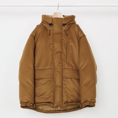 カシミアのフランネル生地で仕立てたダウンジャケット。かなり大きめなサイズ感で、ダウンもしっかり詰まっているため、たっぷりとしたボリュームに仕上がっています。そのため装飾性はほどほどに、デザインはシンプルにバランスを整えました。