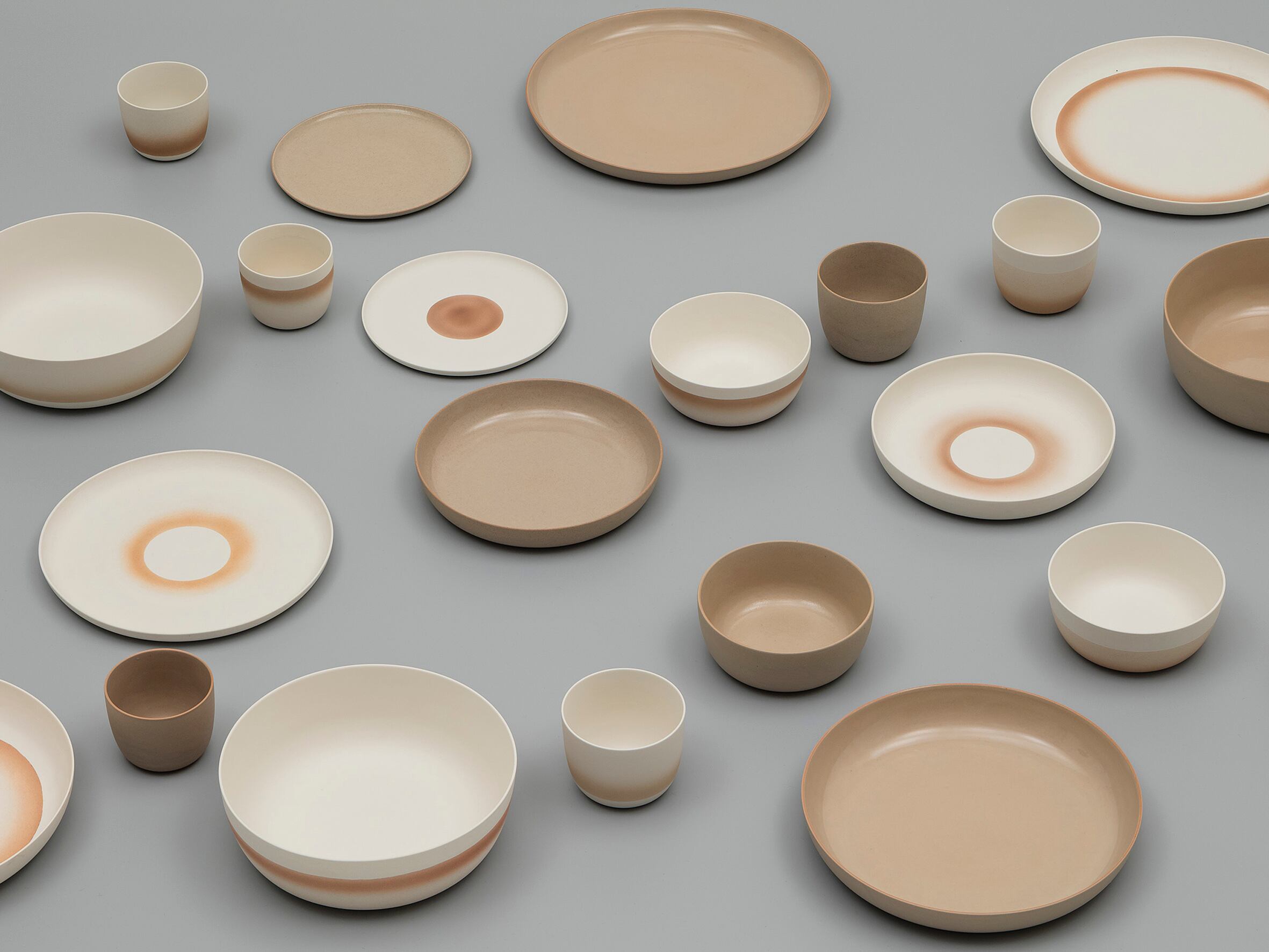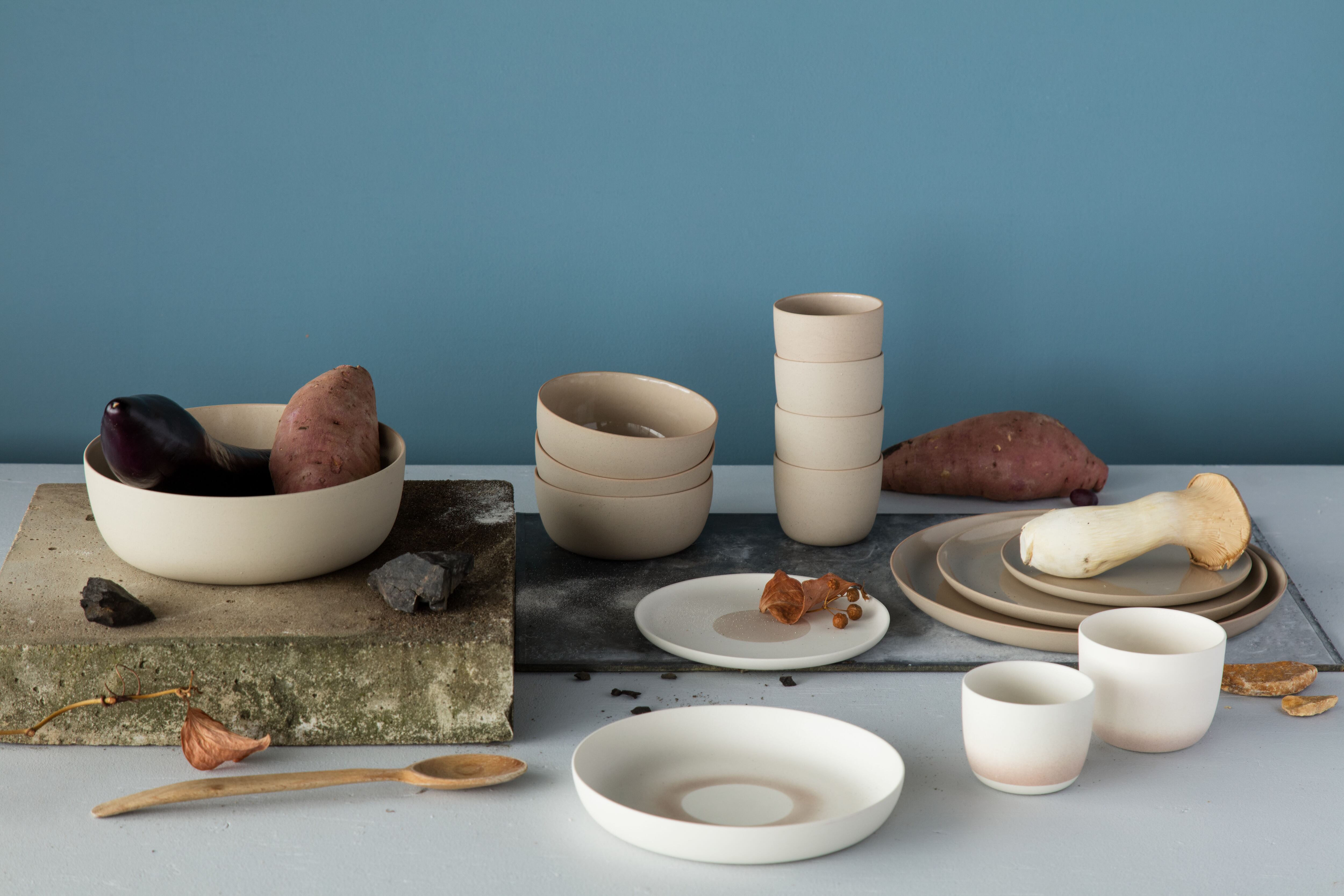 オランダのデザイナー、カースティ・ヴァン・ノートは、素材のリサーチからデザインをスタートさせました。彼女は採石場を訪れ、有田で利用される陶石が不純物を殆ど含まない極めて特別なものであることや、不純物を多く含む原料は全て廃棄されている現状を知りました。そして、普段廃棄される不純物を多く含む陶石に着目し、自然から生み出される美しい色合いの陶土を開発しました。コレクションの2つのシリーズは、独特の色彩と素材感を強調するように、シンプルな形状で構成されています。