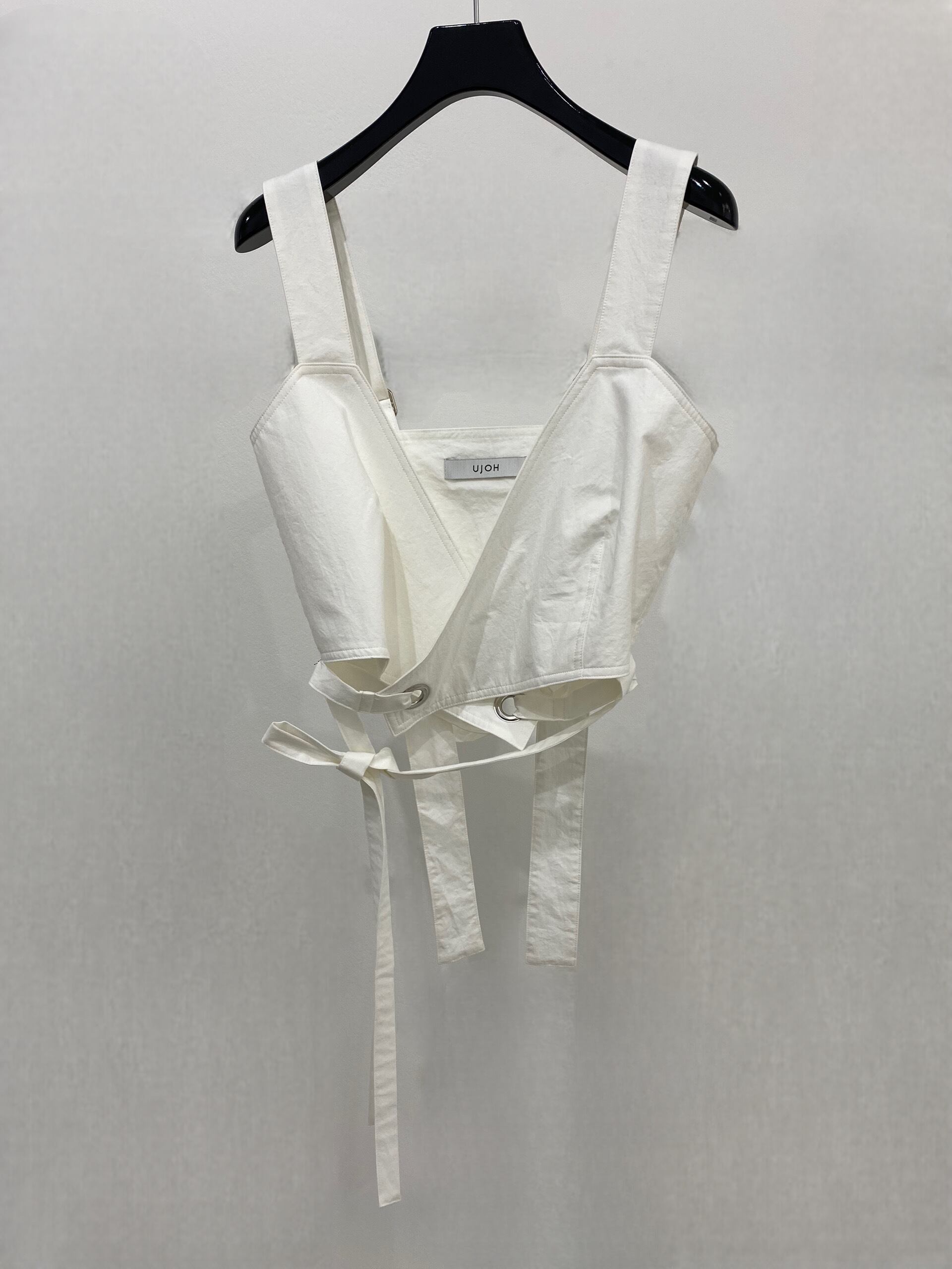 脇にハトメが付き、紐を体に巻きつけるラップ型ビスチェです。