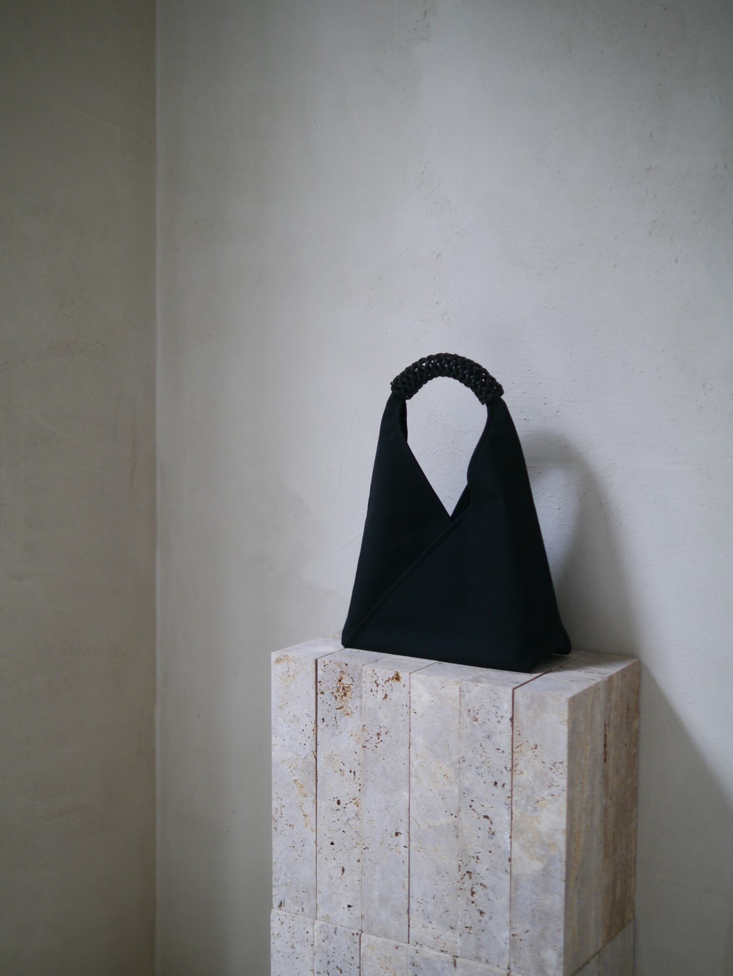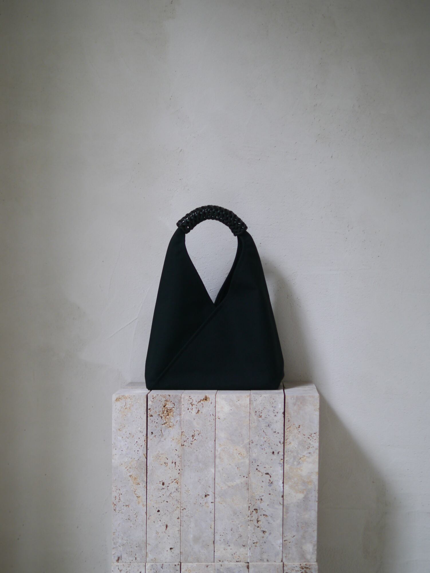 台湾の先住民族の伝統的な編み方をハンドル部分に用いたキャンバス生地のトライアングルバッグで、使い込むごとに色合いが変化するといった経年変化も楽しめます。