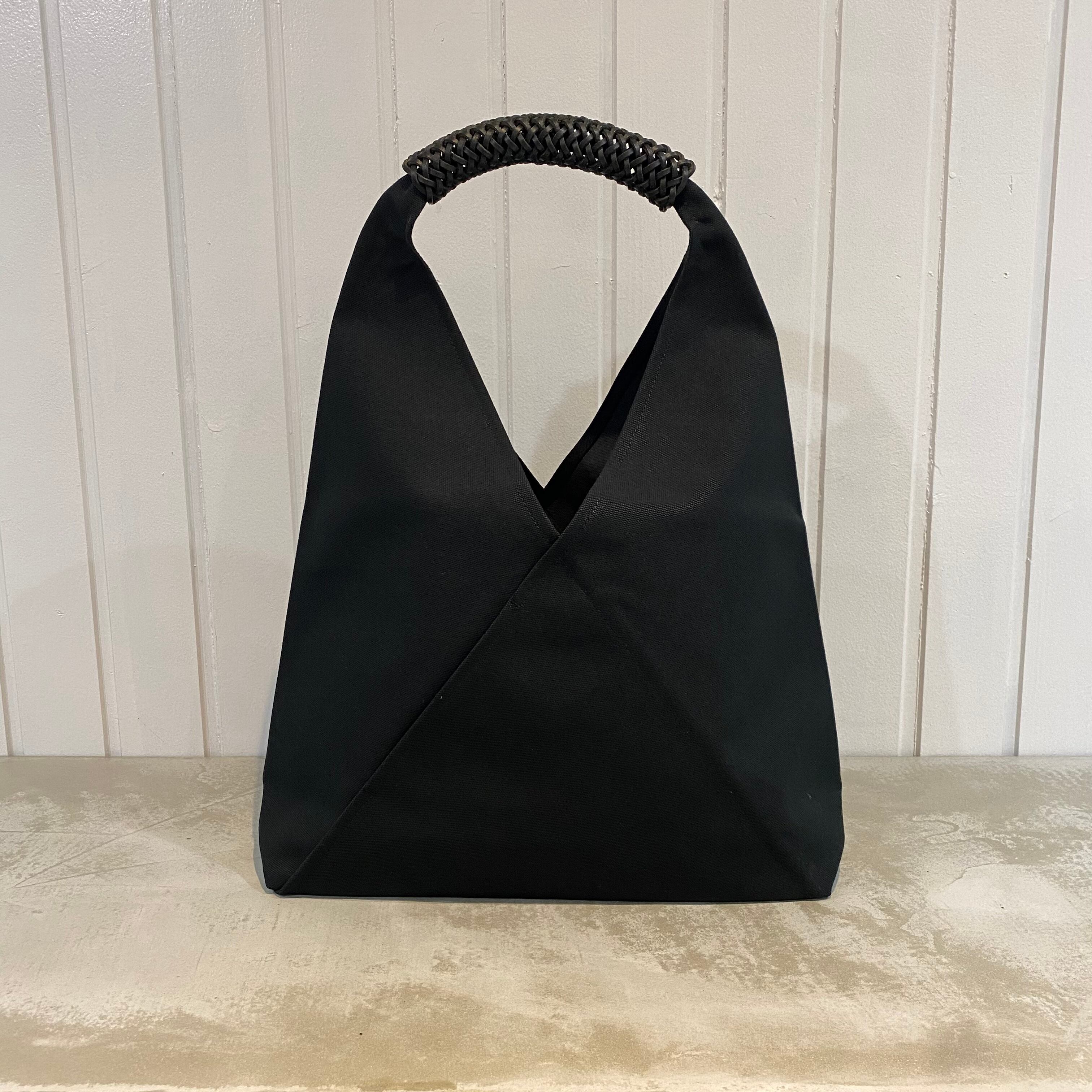 台湾の先住民族の伝統的な編み方をハンドル部分に用いたキャンバス生地のトライアングルバッグで、使い込むごとに色合いが変化するといった経年変化も楽しめます。