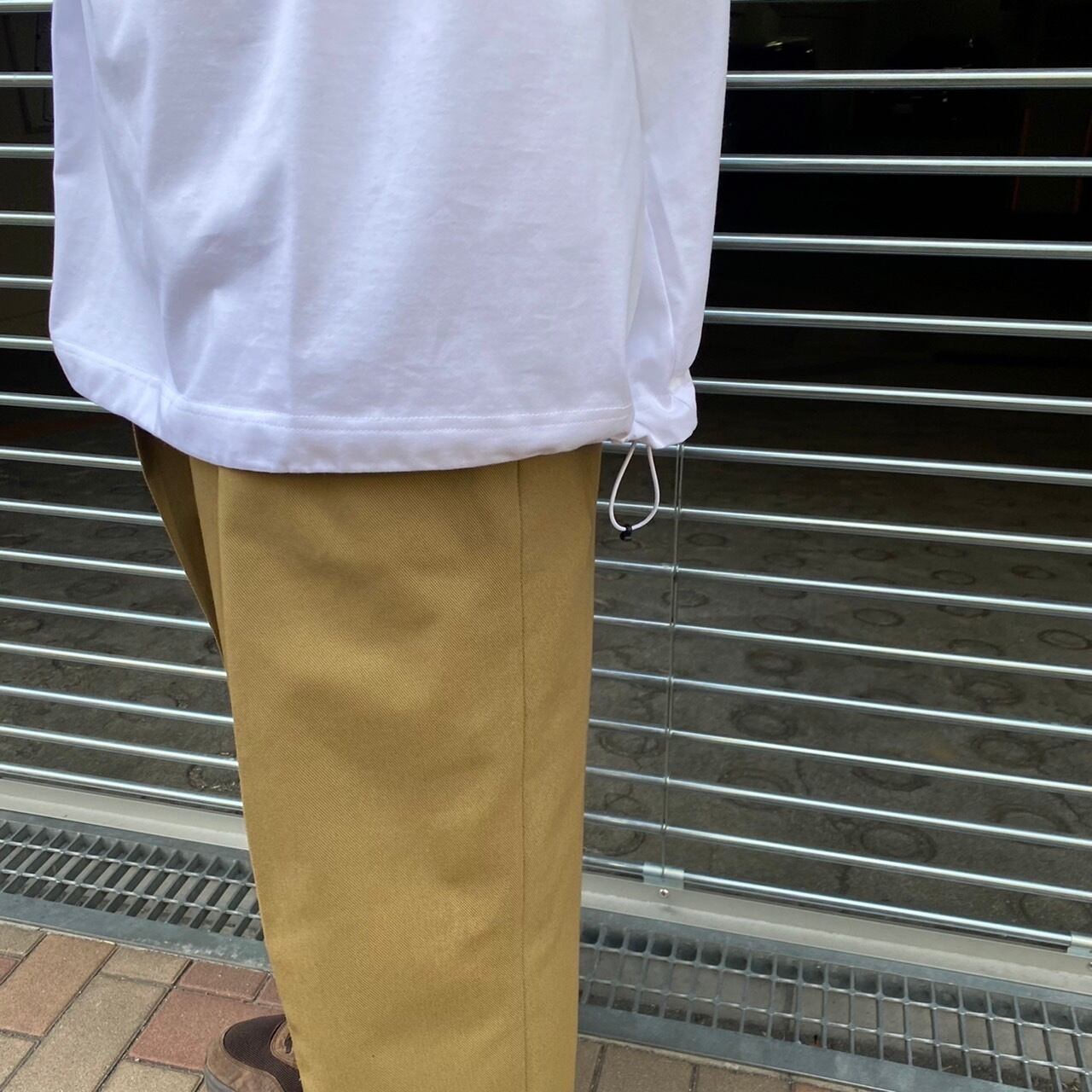 裾スピンドルを絞ることによってシルエットの変化が楽しめるTシャツとなっております。