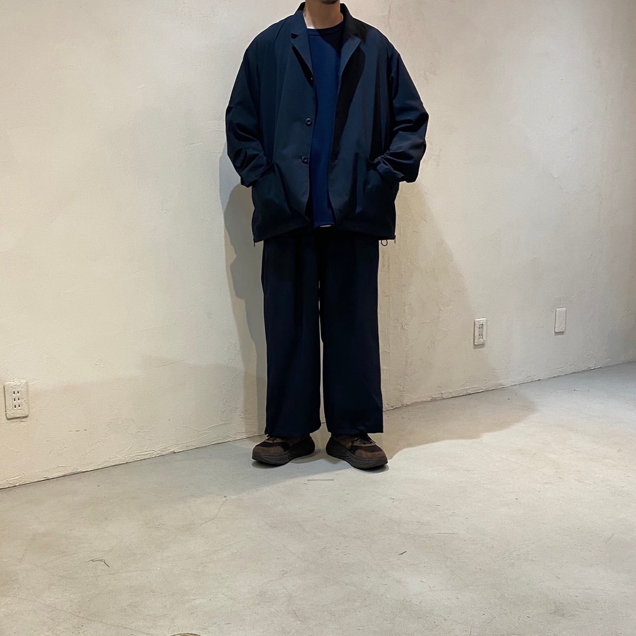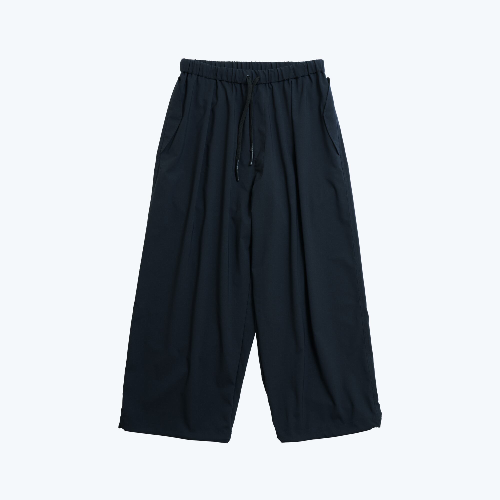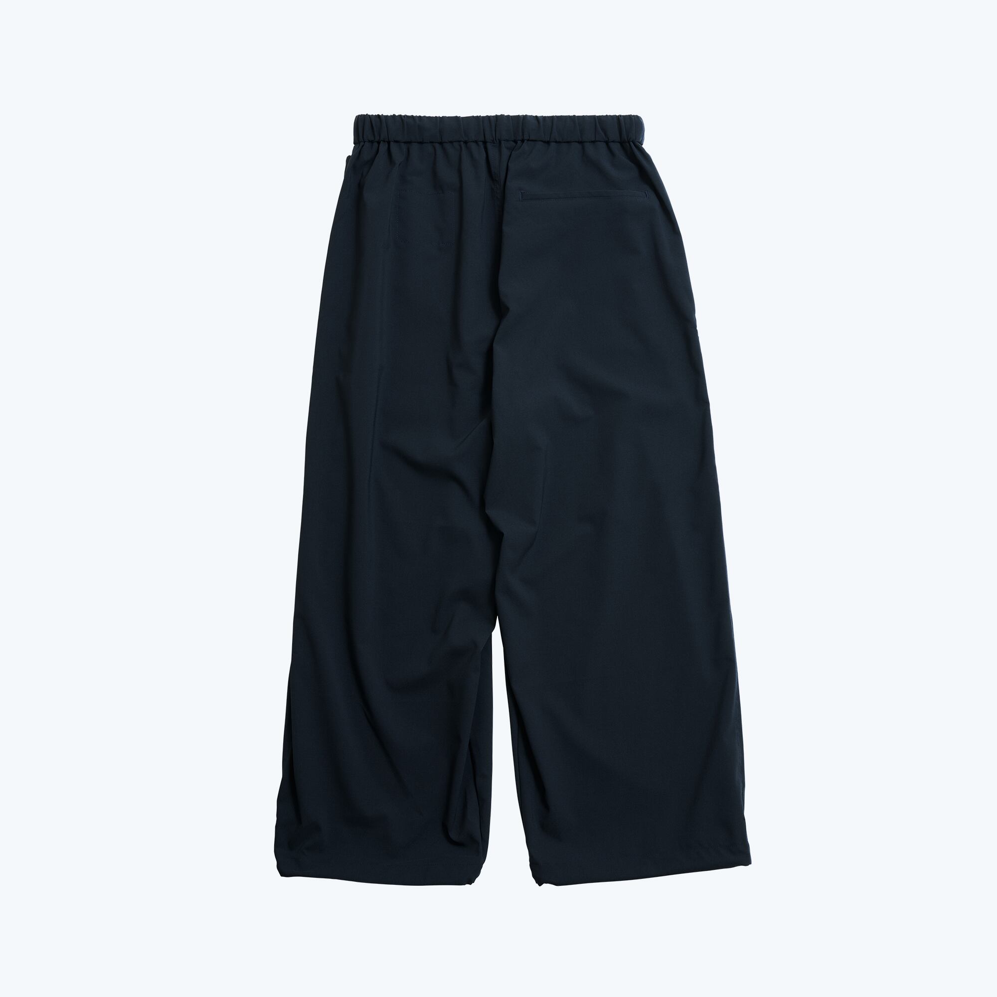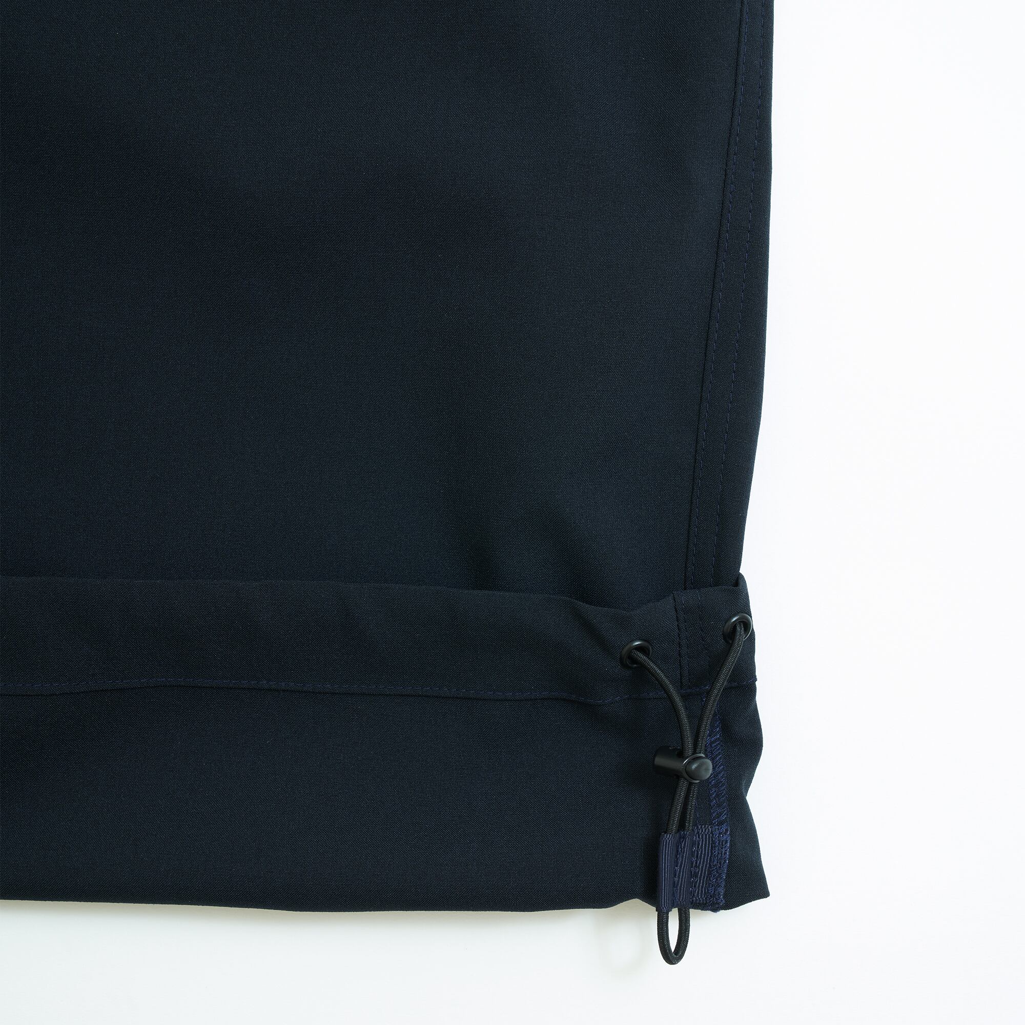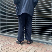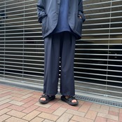 テーパードパンツよりもワタリが太くなっている分、左右に入ったのタックとウエストのドローコードの調整で、きれいなプリーツの表情を作れます。