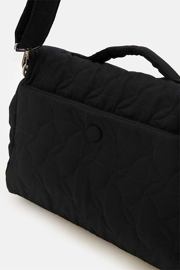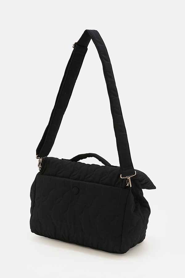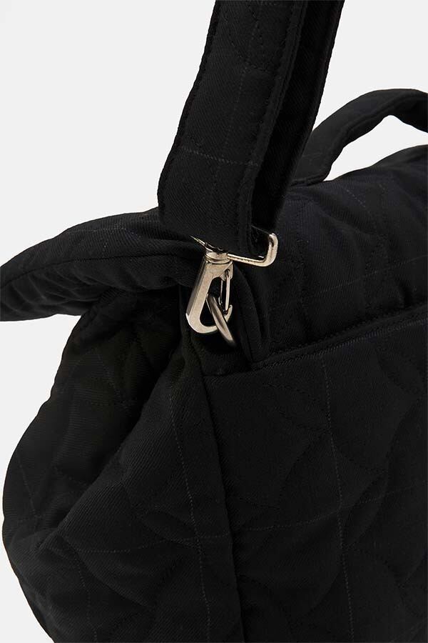キルティング素材となっており、外側にスナップ付きポケット1つ、内側ポケットに2つと機能性の高いバッグとなっております。