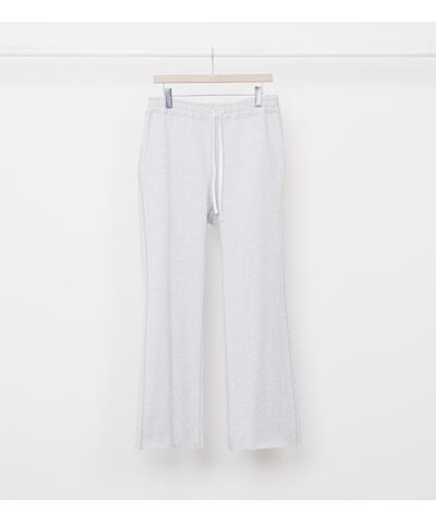 スウェットパンツをフレアシルエットにすることで新鮮な印象となっています。