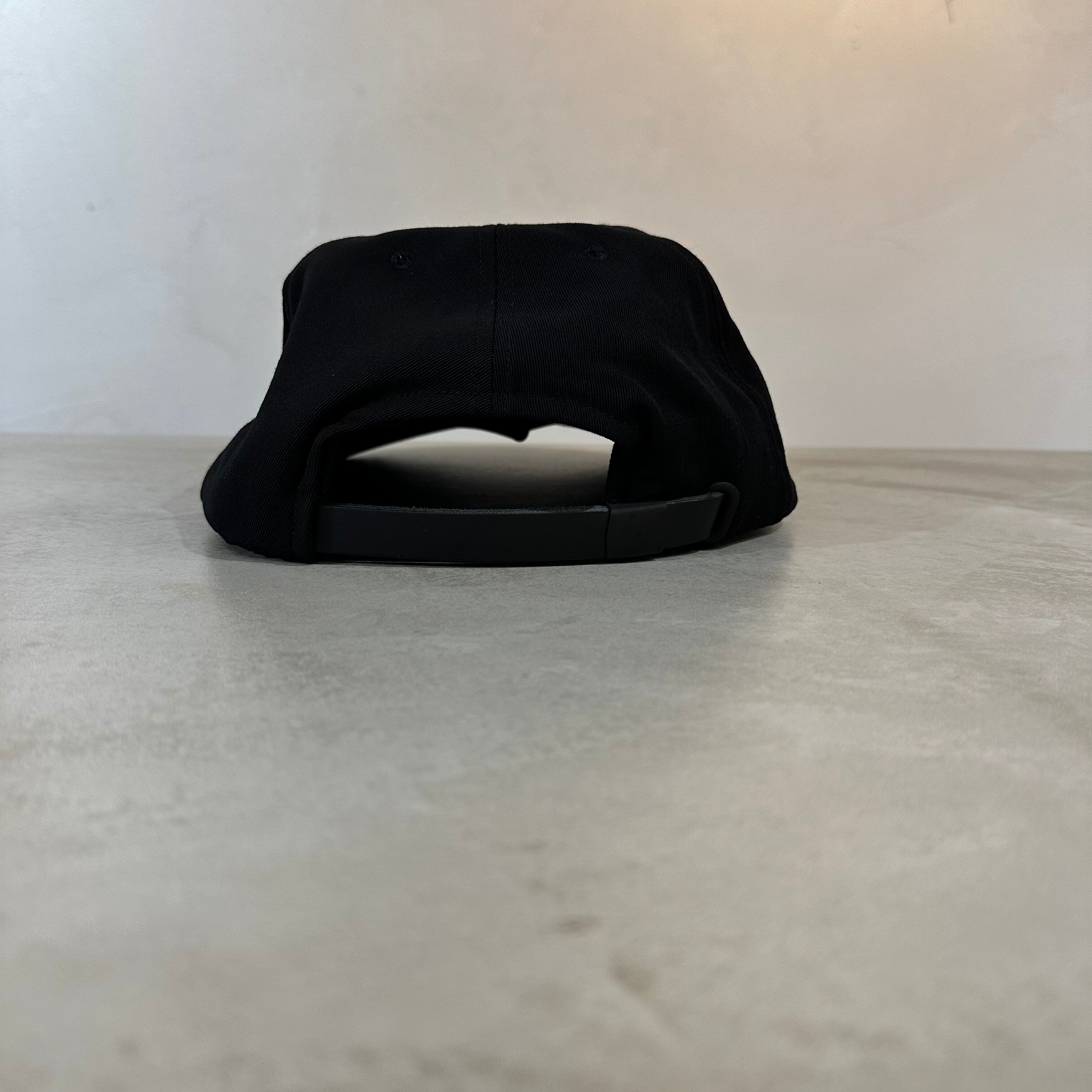 後ろアジャスターは牛革ベルトに別注塗装したシックブラックのバックルと小判ハトメ。