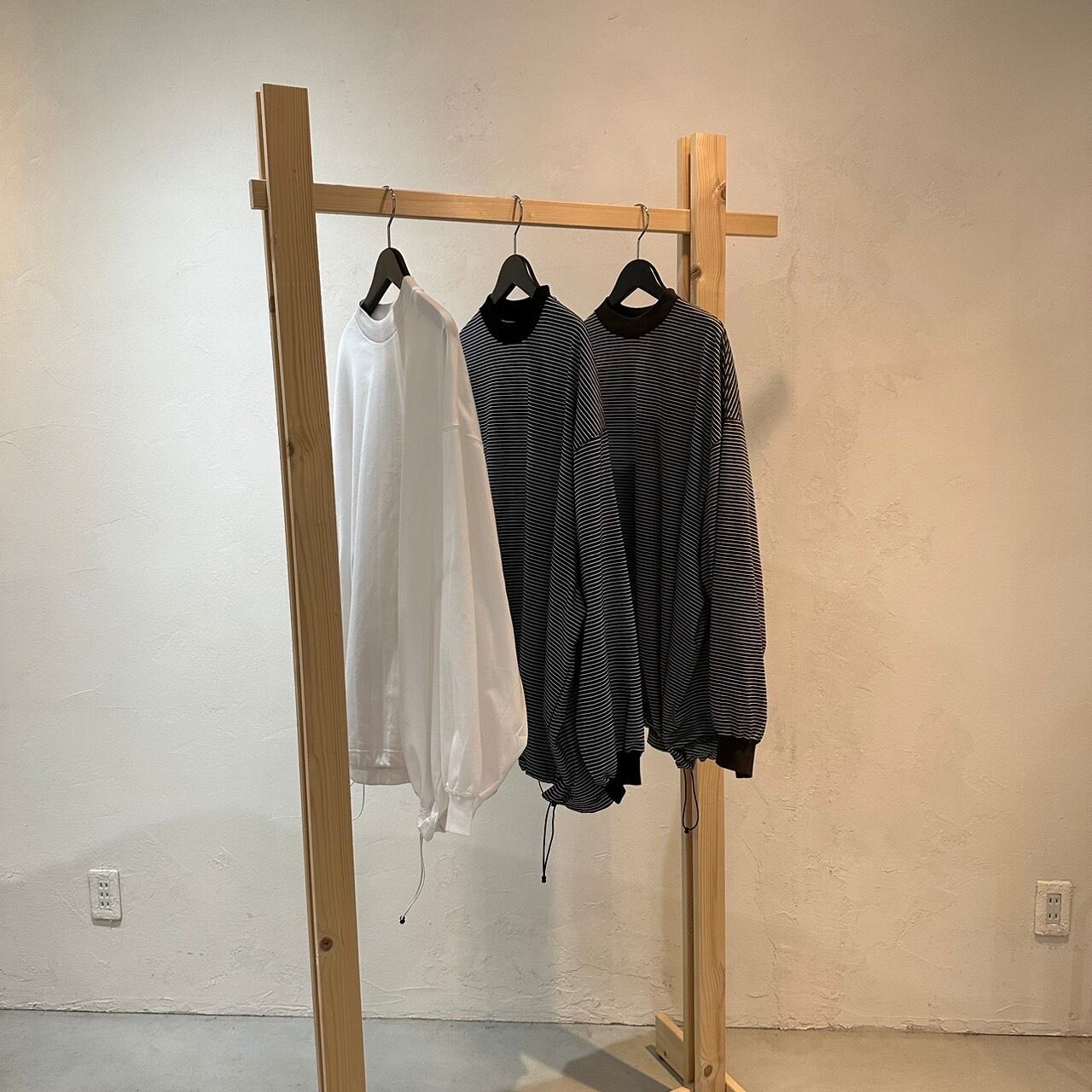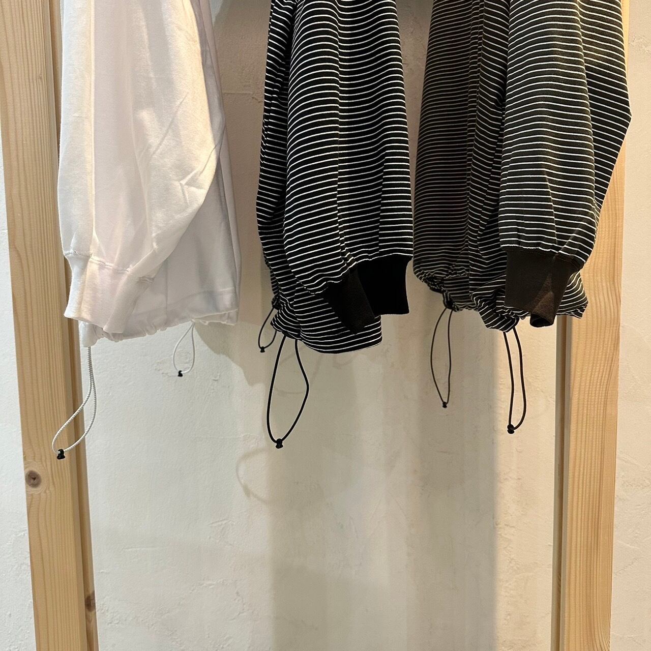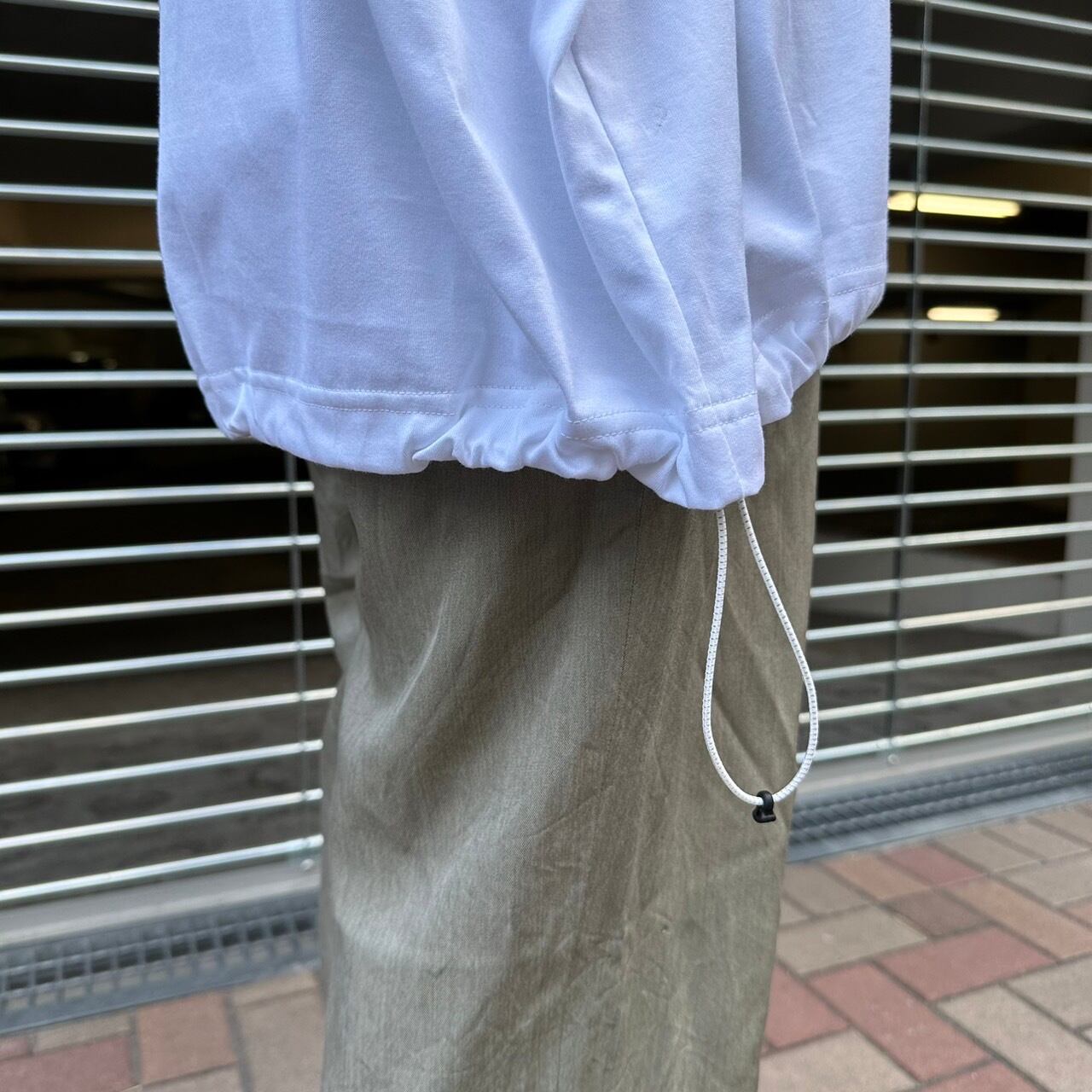 裾スピンドルを絞ることによってシルエットの変化が楽しめるTシャツとなっております。