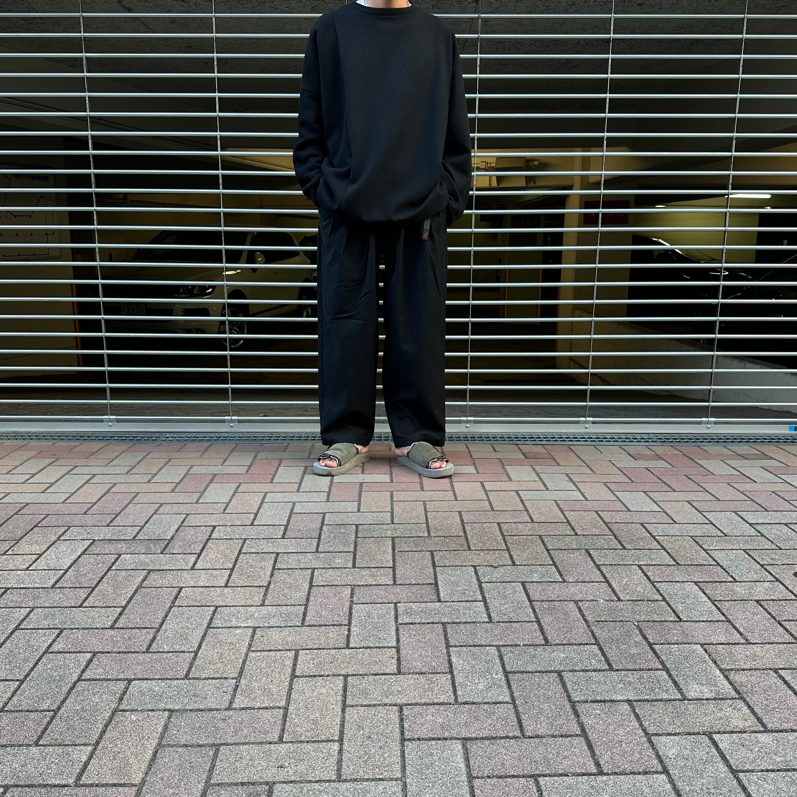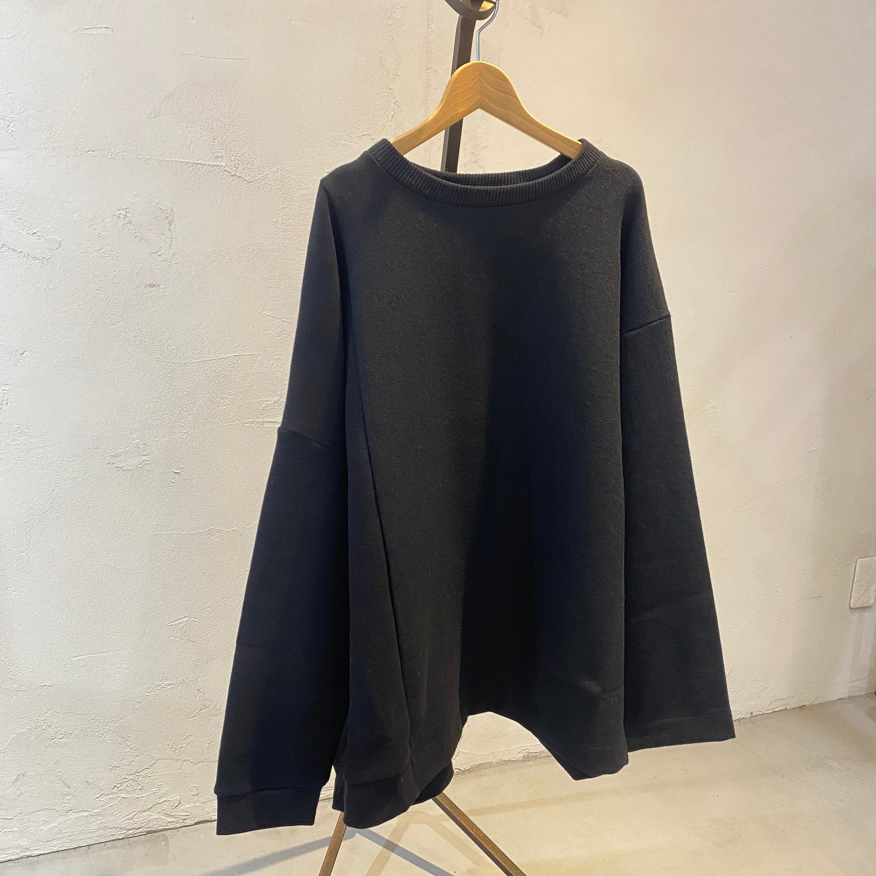 左半身には暖かみのあるウール素材、右半身にはやわらかいスウェット生地を使用したワイドシルエットのプルオーバー。