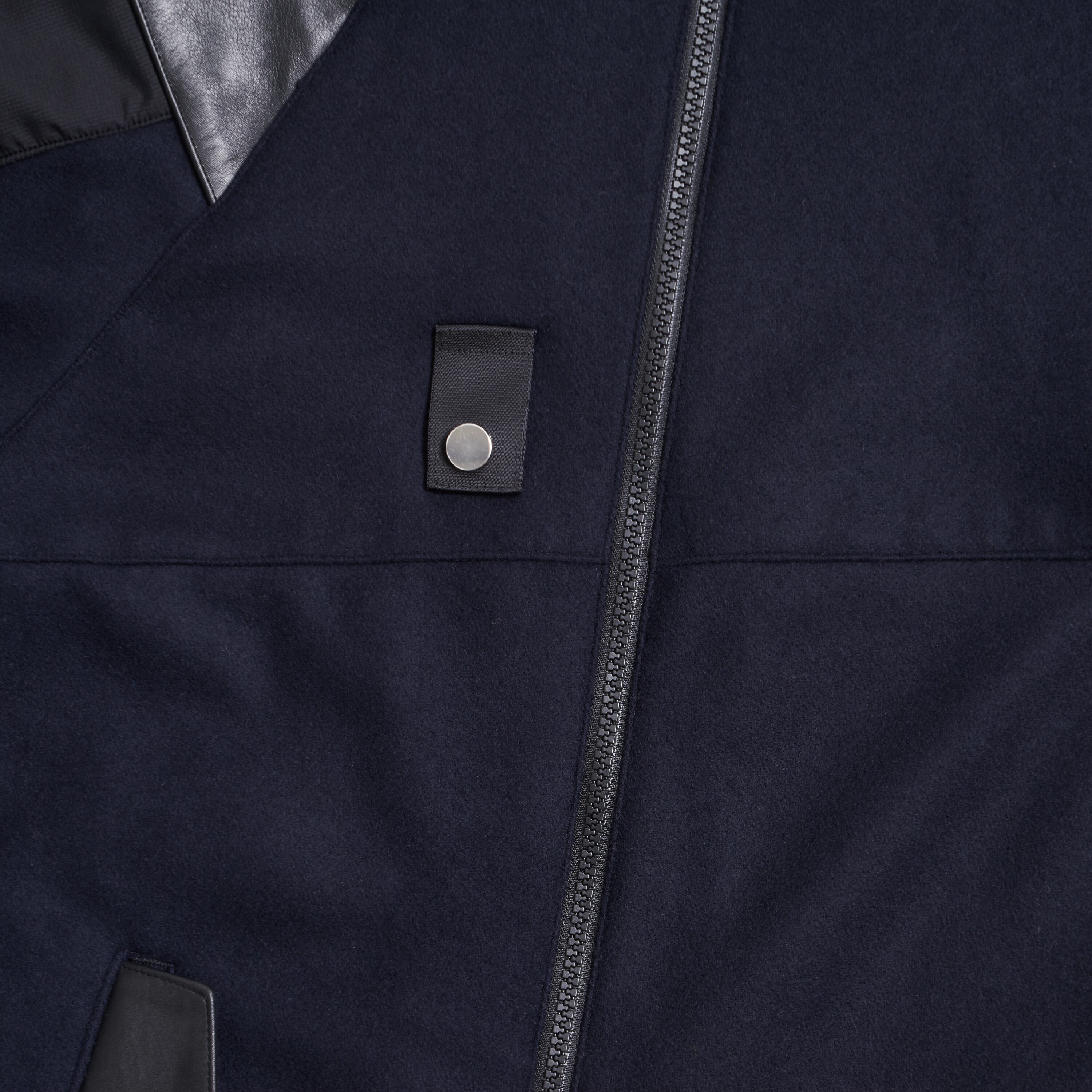 通常のウールブレンドよりも光沢感と保温性にすぐれたジロンラムウール糸で編み立てられたメルトンと日本製の牛皮革と高密度のナイロン素材で構成されたブルゾン。