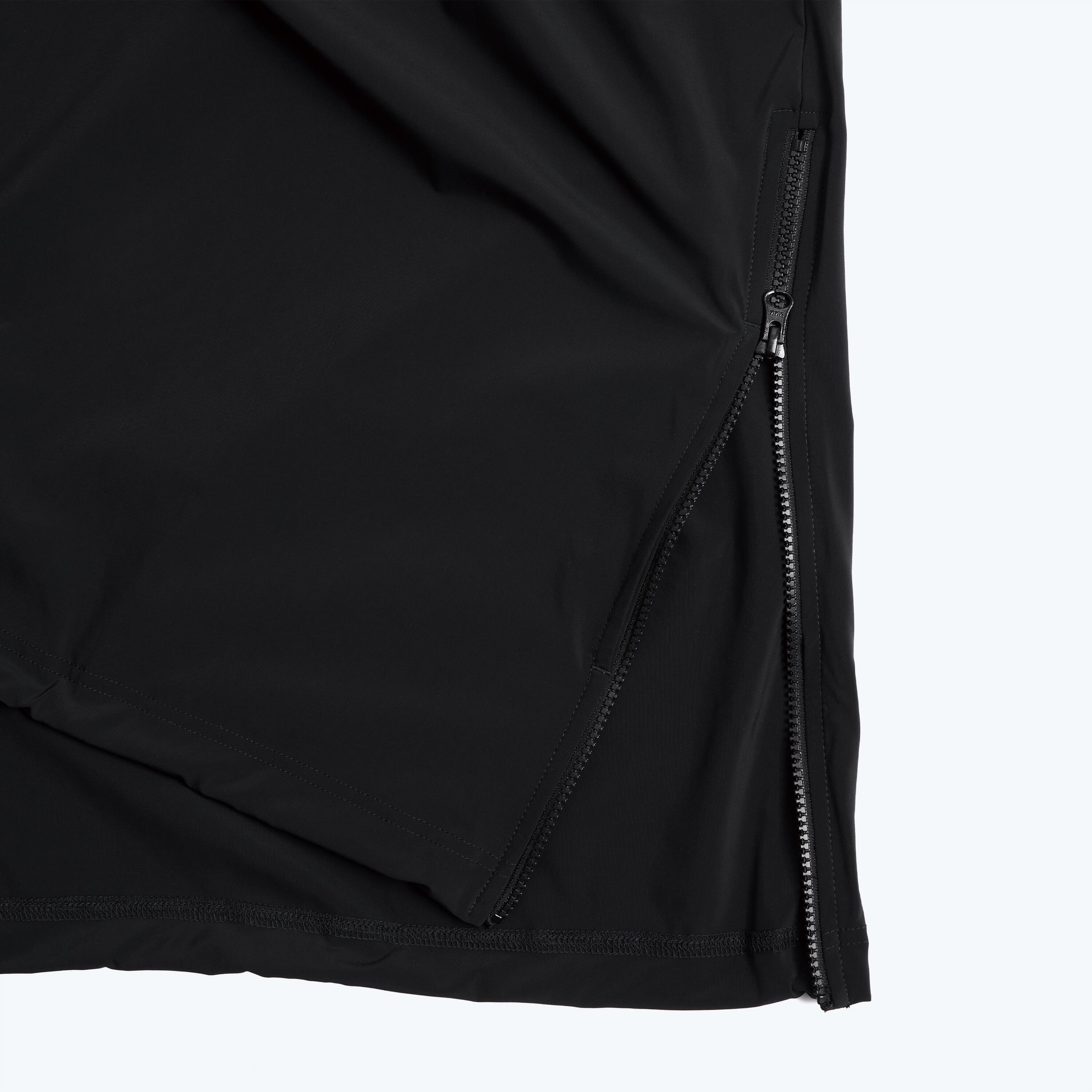 裾上両サイドにポケットを配備し、左脇のジップの開閉でインナーが見え隠れし、さらに体温調整が可能。