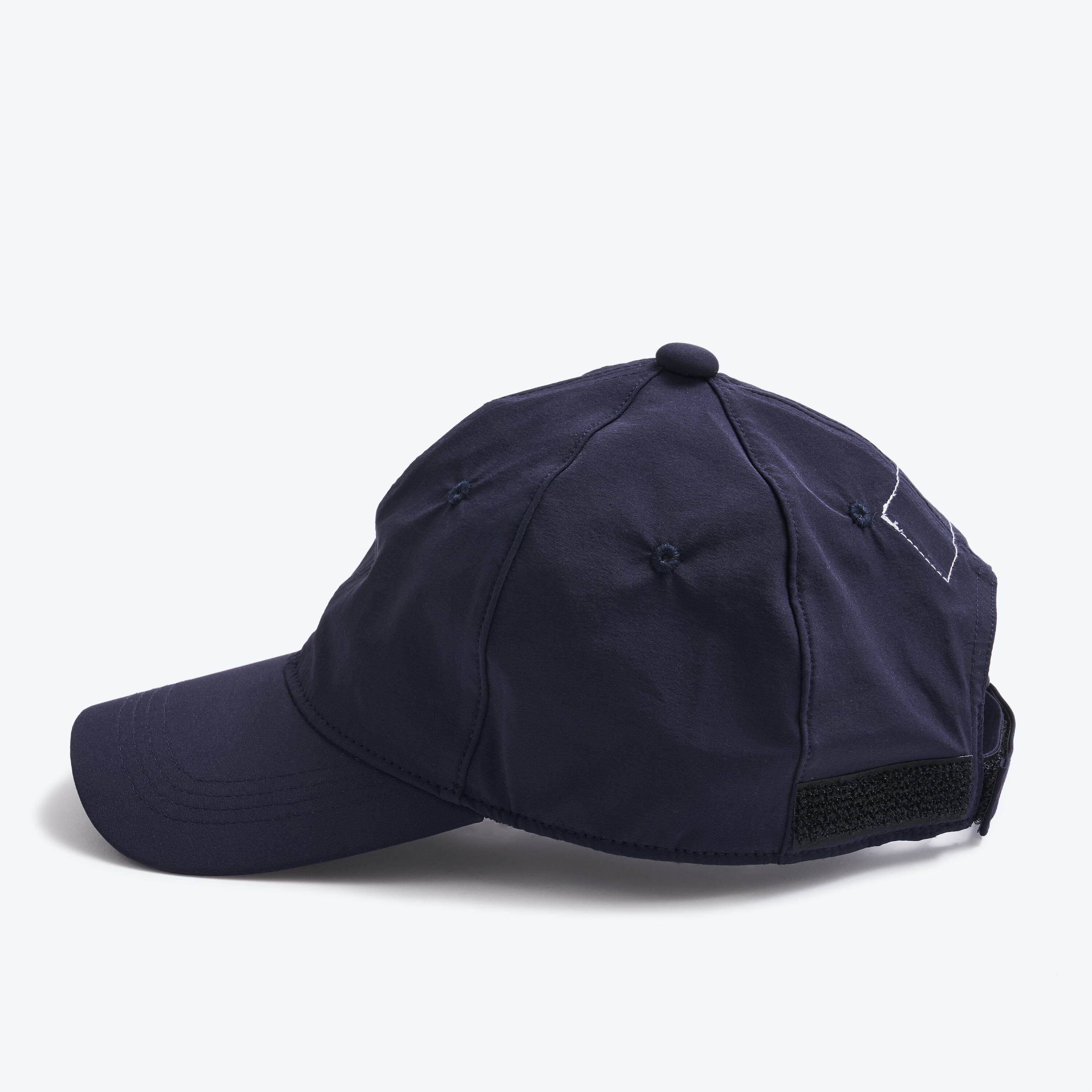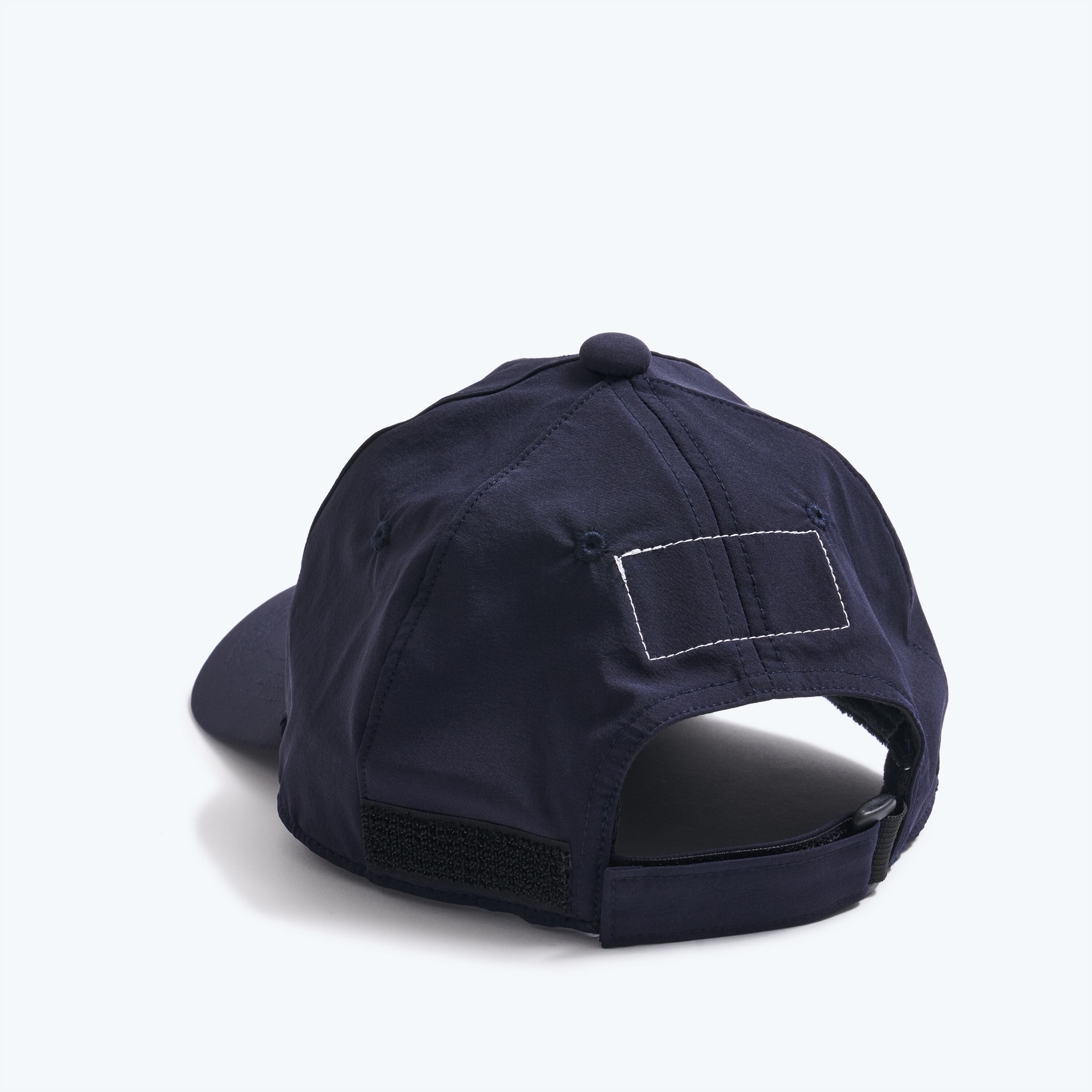 頭部のベルクロのスナップバックはベルトの収まりが良いよう長めに配備し