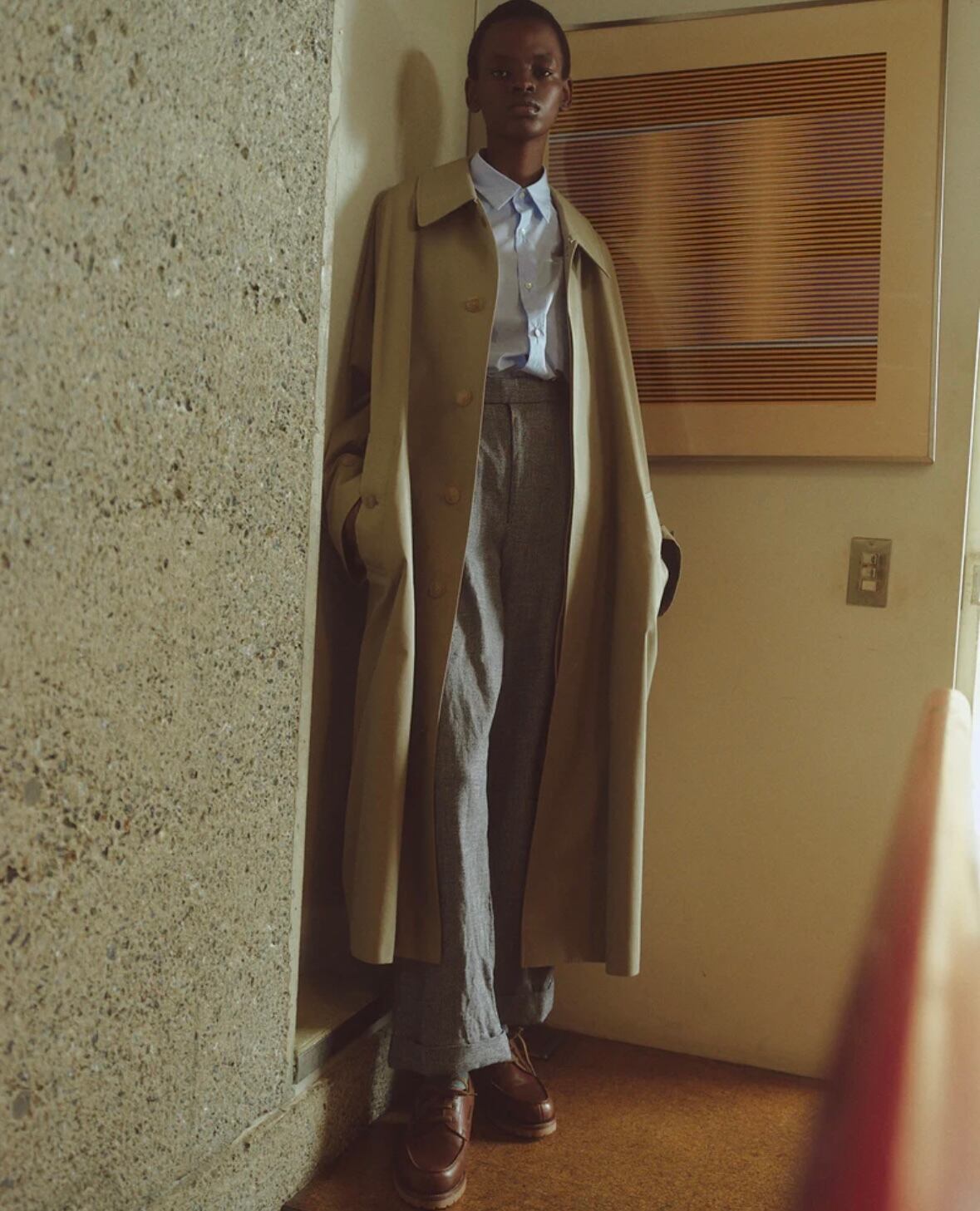 身幅たっぷりのステンカラーコートは、膝下まである着丈がクラシックな雰囲気を漂わせます。