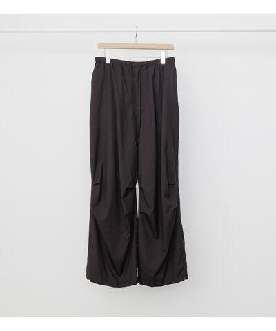 コクーンシルエットのイージーパンツをベースに、膝にタックを入れることでミリタリーパンツのような雰囲気に。