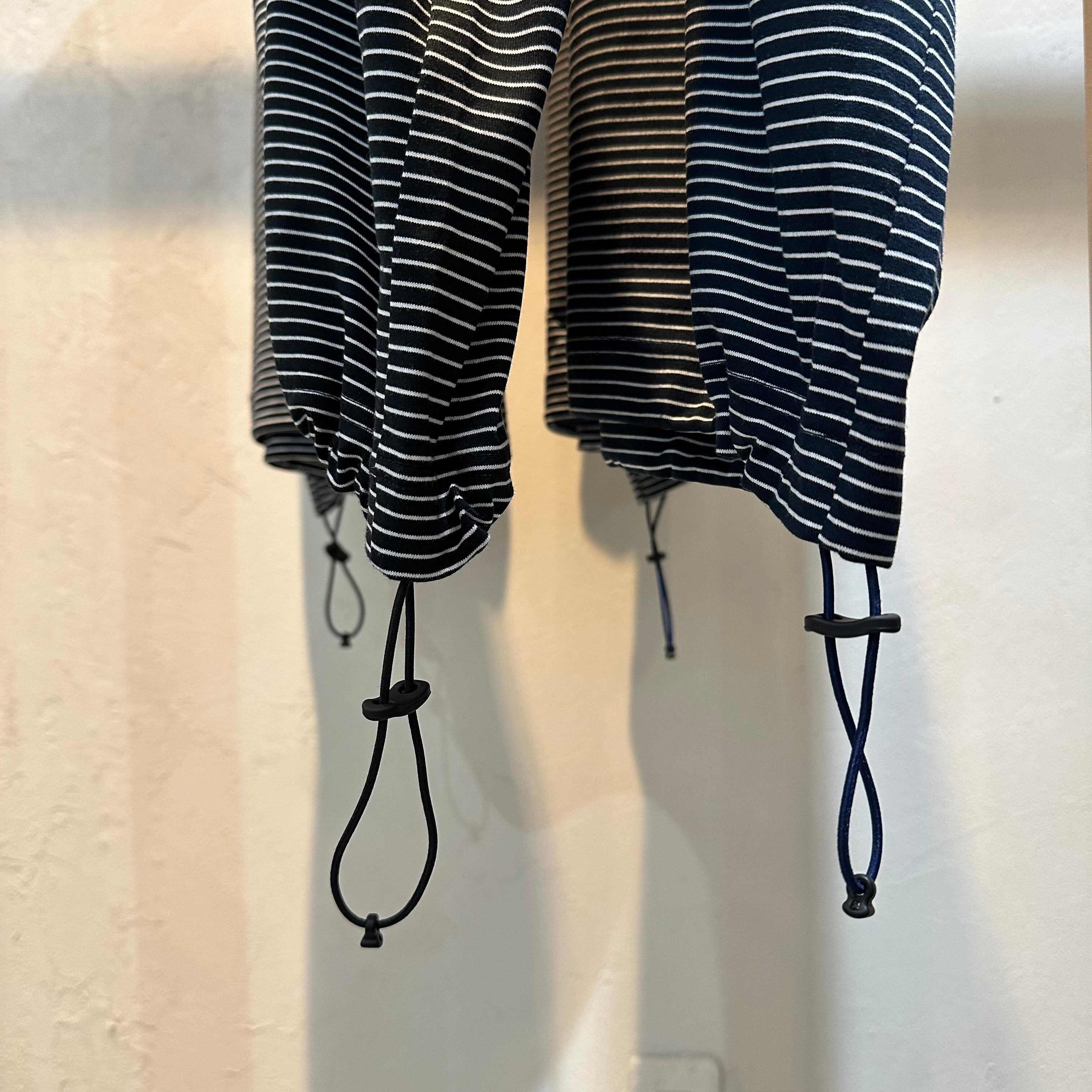 裾スピンドルを絞ることによってシルエットの変化が楽しめるTシャツとなっております。