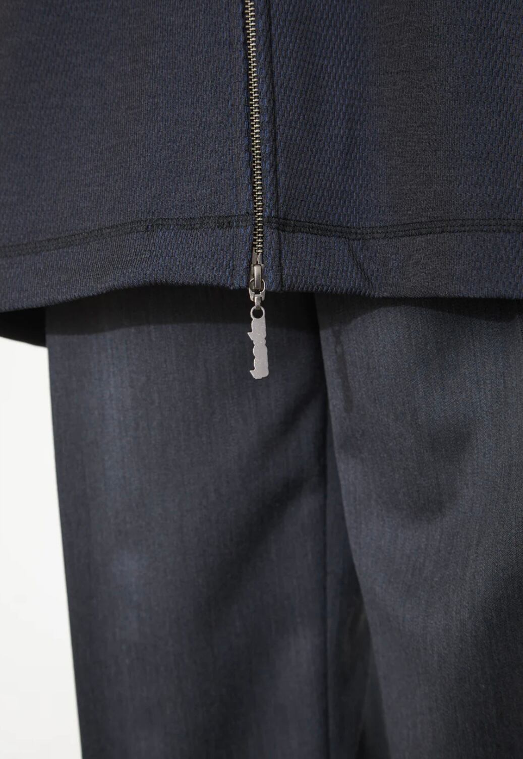 オリジナルで作成されたファスナーがダブルで付けられ、フロントファスナーの上下調整により、スタイリングにアレンジを加えることが可能となっています。