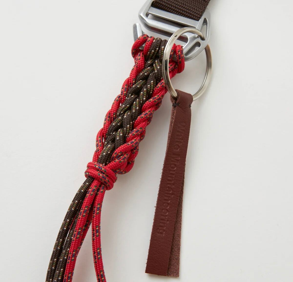 アウトドア調のミックス柄ロープをマクラメの技法を応用して編み上げたバイカラーのキーチェーン。