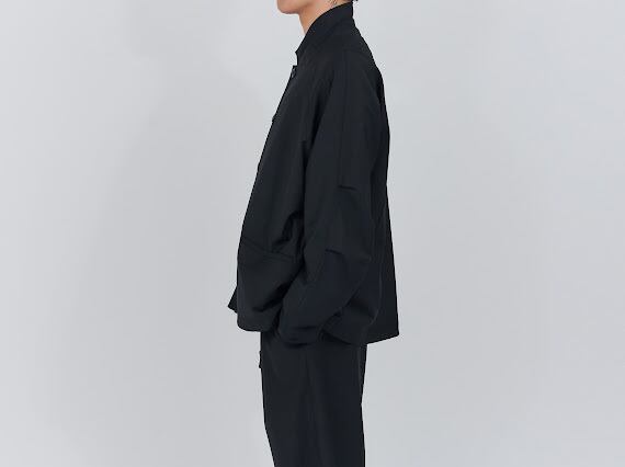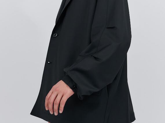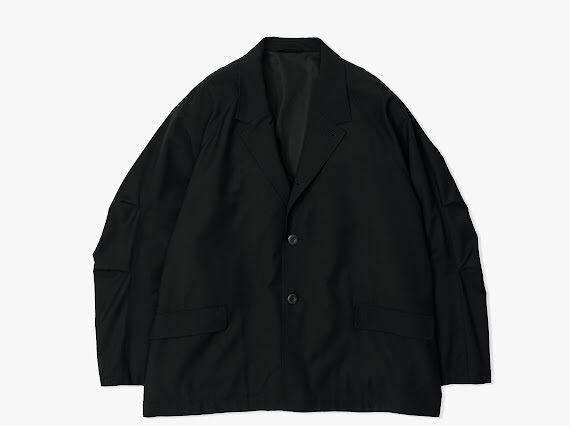 シルエットは身幅に余白を持たせたボックスシルエットで、両肘にはアクションプリーツを配し十分な可動域を確保。
