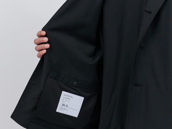裏地にはメッシュを採用し高い通気性を実現し、両サイドにスナップ付きの内ポケットをつけることで携帯電話を収納してもシルエットが崩れないよう設計しています。