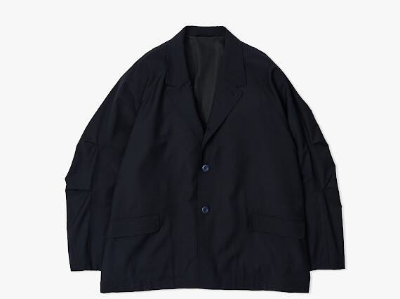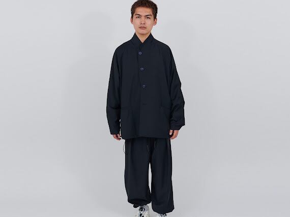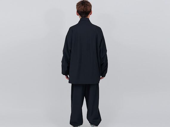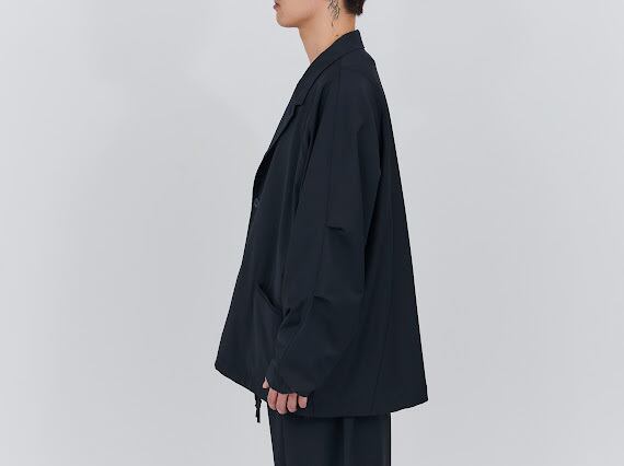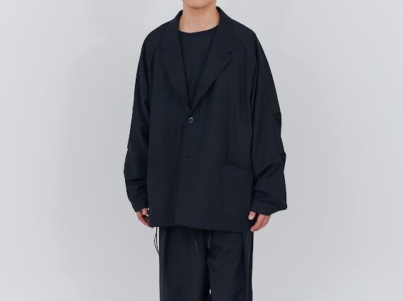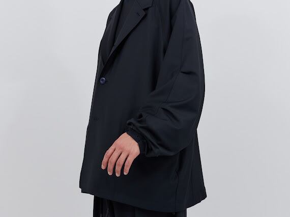 シルエットは身幅に余白を持たせたボックスシルエットで、両肘にはアクションプリーツを配し十分な可動域を確保。
