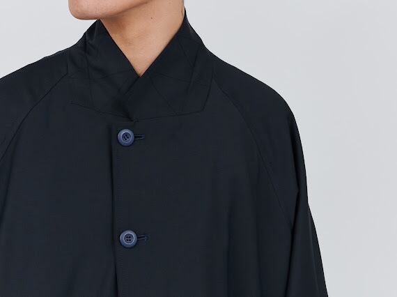 フロントボタンは段返りの三つ釦を採用し、ラペル裏のボタンをとめることでカバーオールのような形態でも着用いただけます。