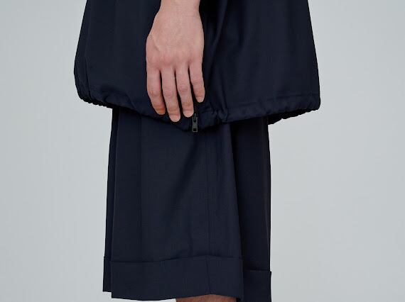 裾はダブルで仕立て、バックにはフラップポケットを配し、スラックスのディテールを採用しています。
