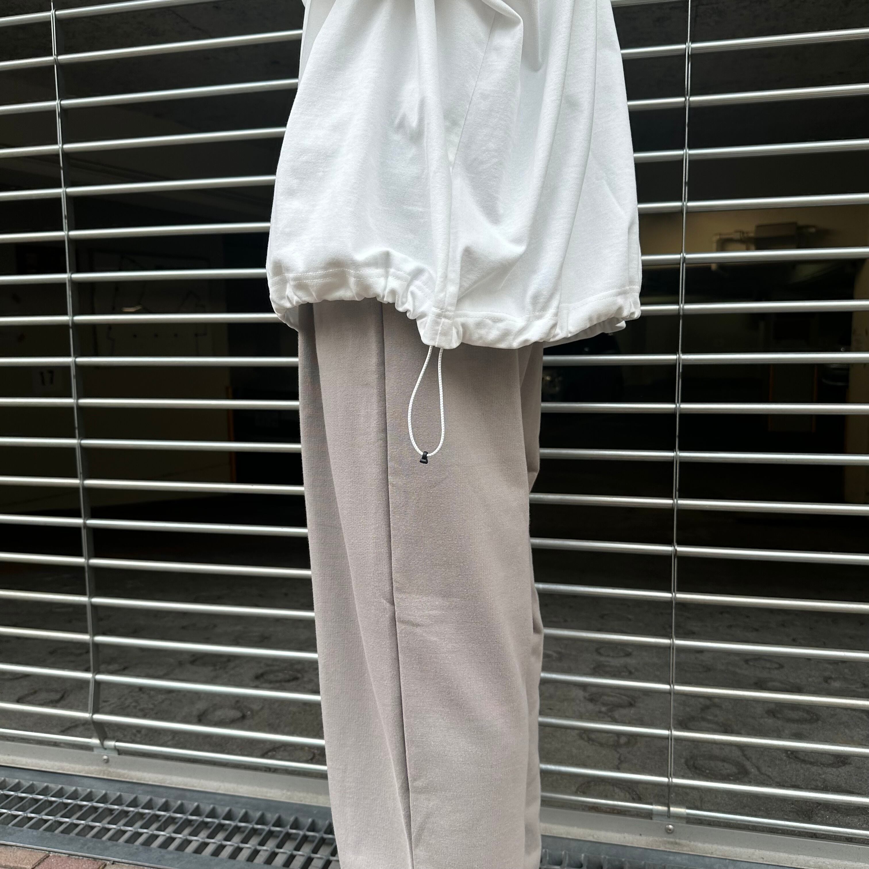 フロント、バックともに施された切り替えデザインが特徴で裾スピンドルを絞ることによってシルエットの変化が楽しめるアイテムとなっております。